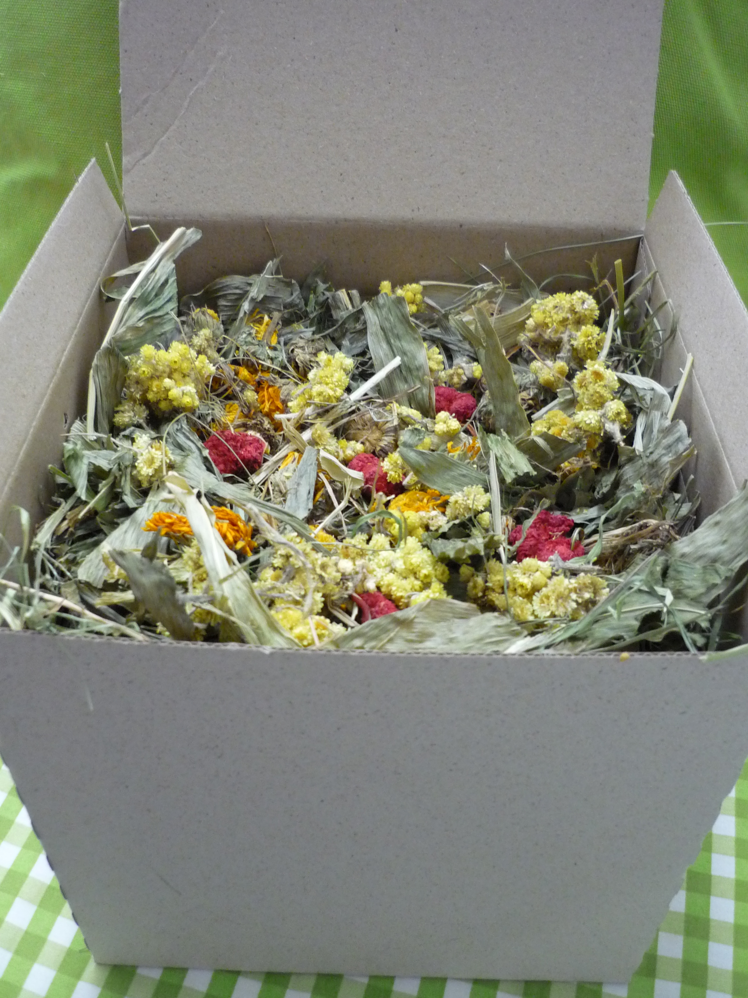 befüllt den Würfel diese mit verschiedensten Leckereinen aus unserem Sortiment, z. B. Erbstkraut mit Rose, Löwenzahnblütenmix, Blütenheu uvm.