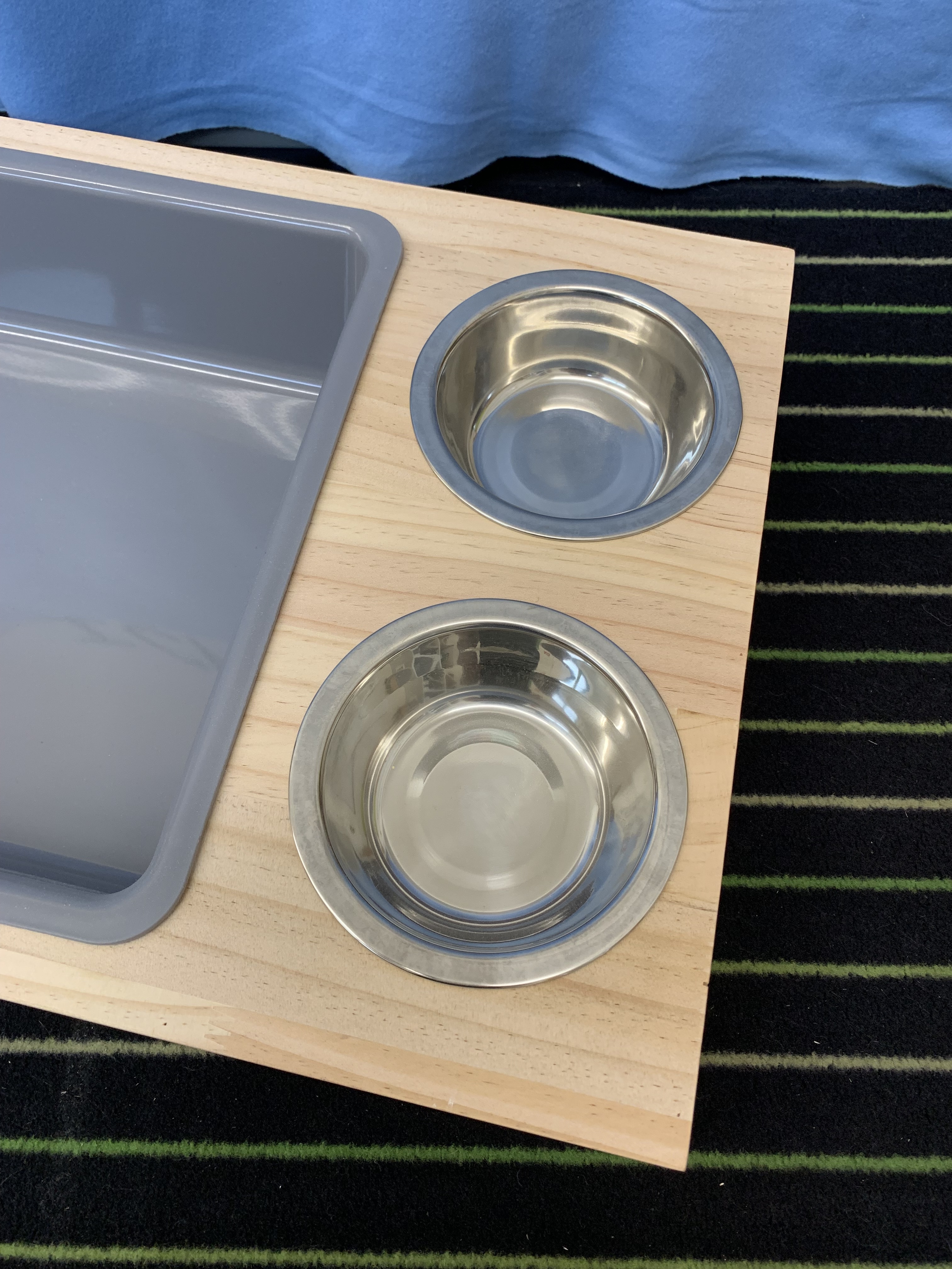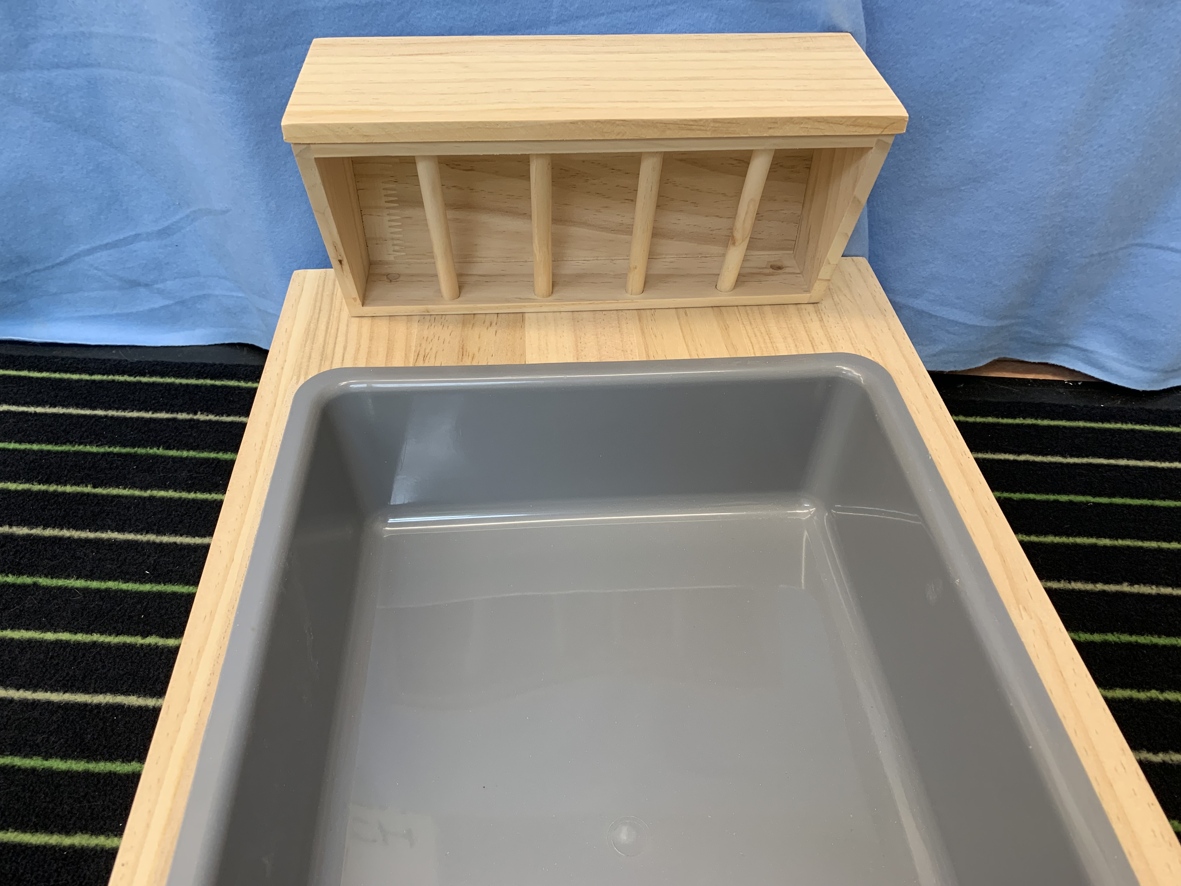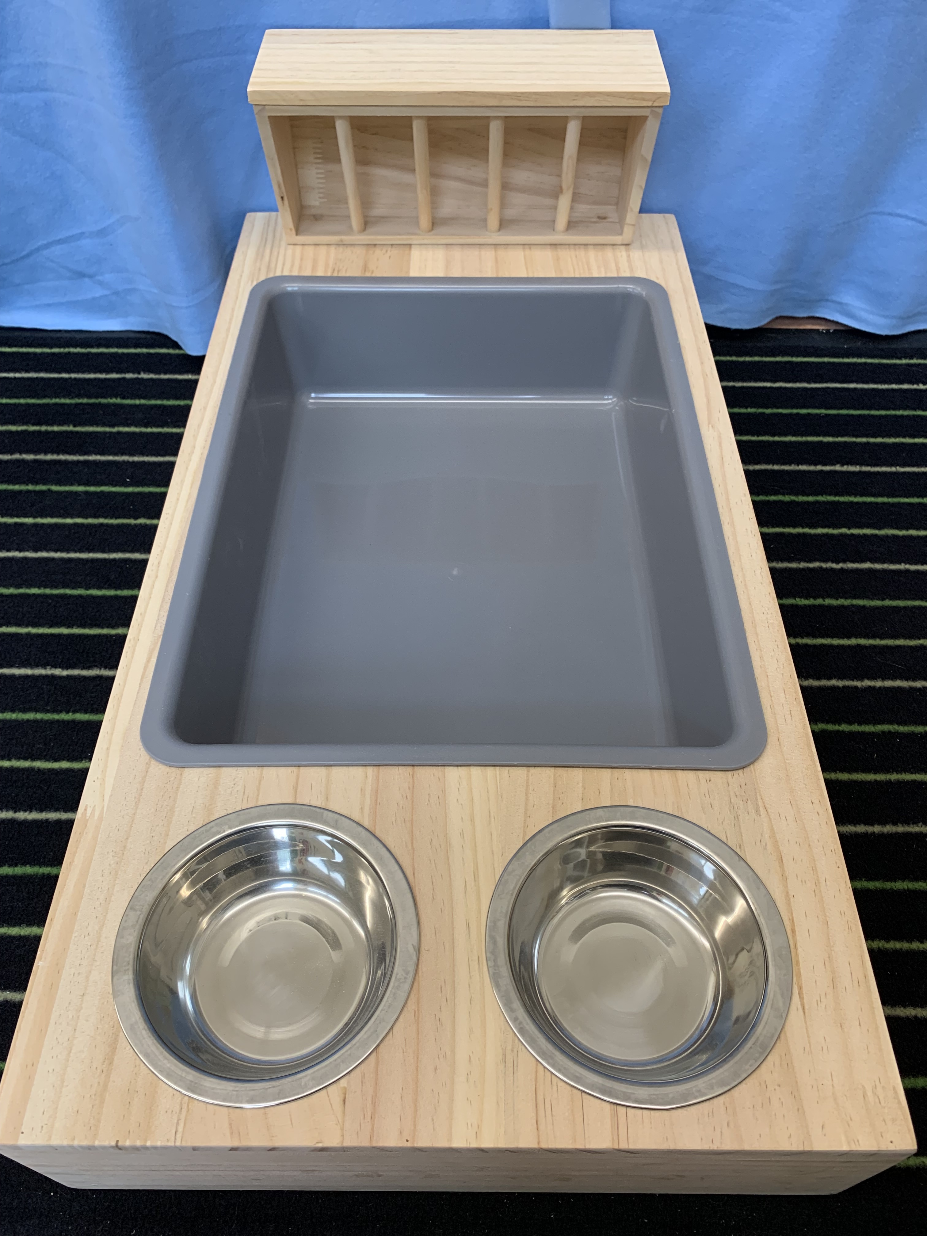 Diese Futtertoilette ist der perfekte Ort für kleine bis mittelgroße Kaninchenrassen. Die Kombination aus Toliette, Heuraufe und Futternäpfen ist sehr beliebt, da Kaninchen meist dort böbbeln wo sie fressen. Der Rahmen und die kleine Heuraufe mit abnehmbarem Deckel sind aus Kiefernholz gefertigt. Die Kunststoffwanne kann ebenso zur Reiningung entnommen werden, wie die beiden Edelstahlnäpfe.