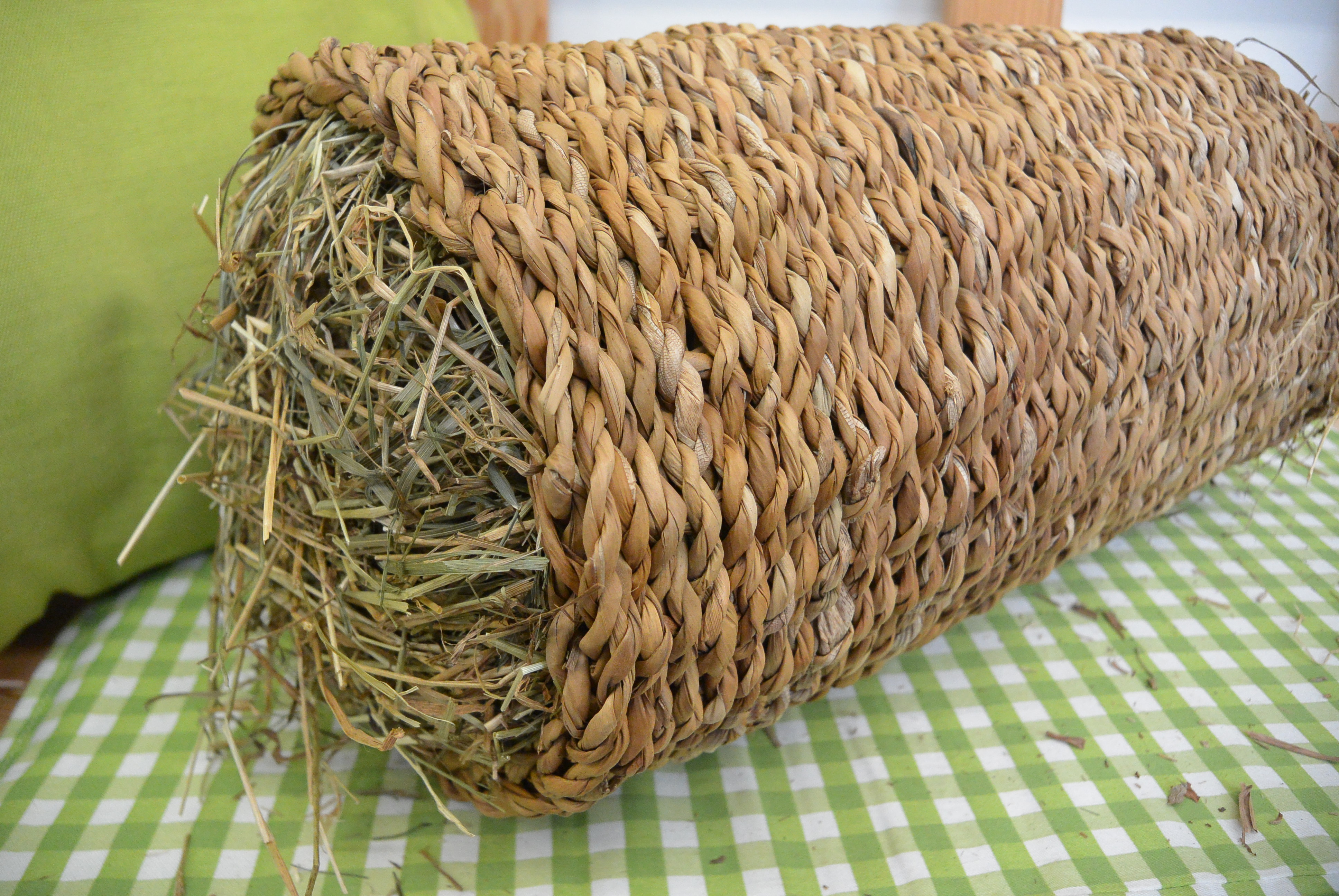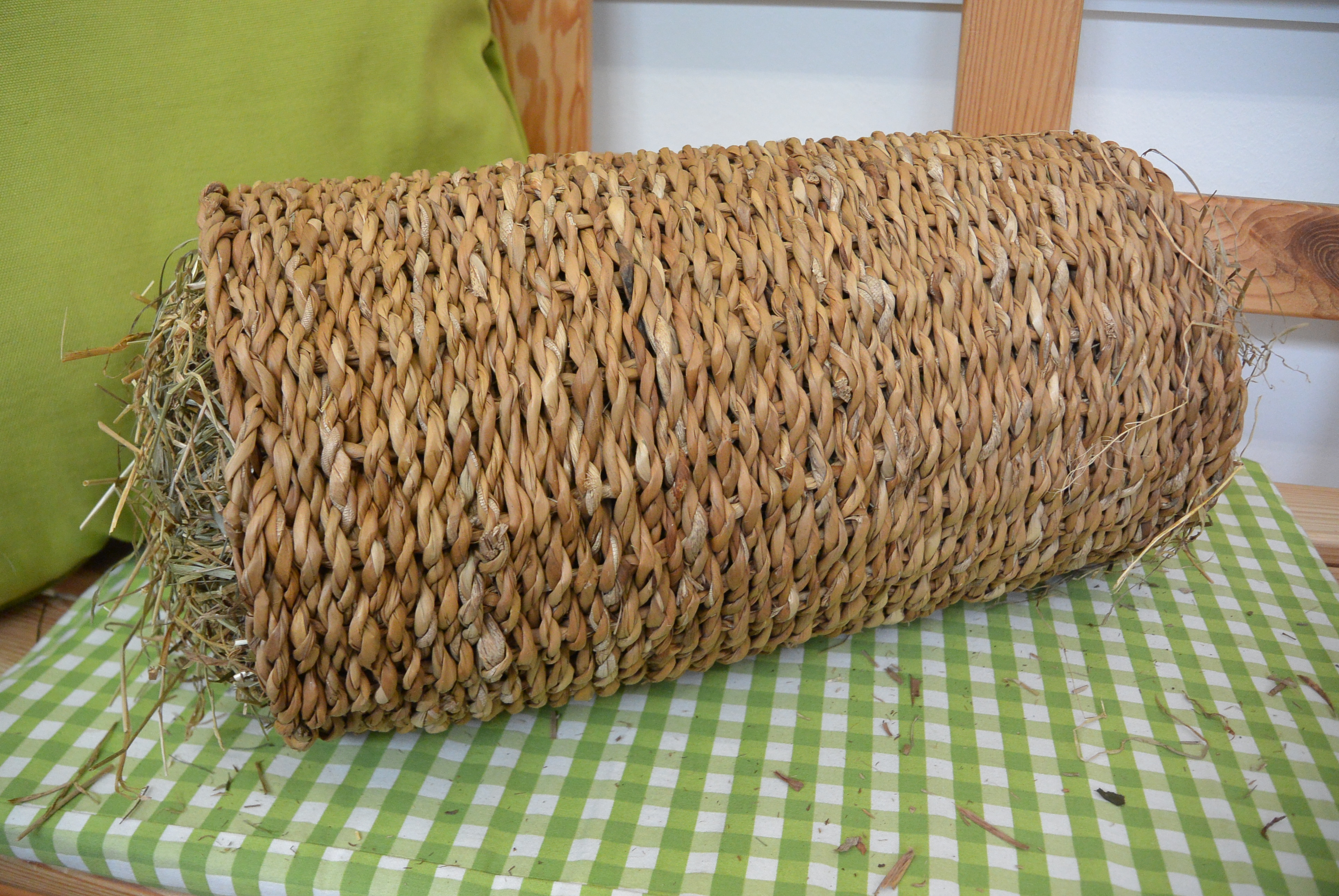 Geflochtener Grastunnel aus Miscanthus-Gras -gefüllt mit duftendem Bergwiesenheu - zum Spielen, Verstecken und Knabbern