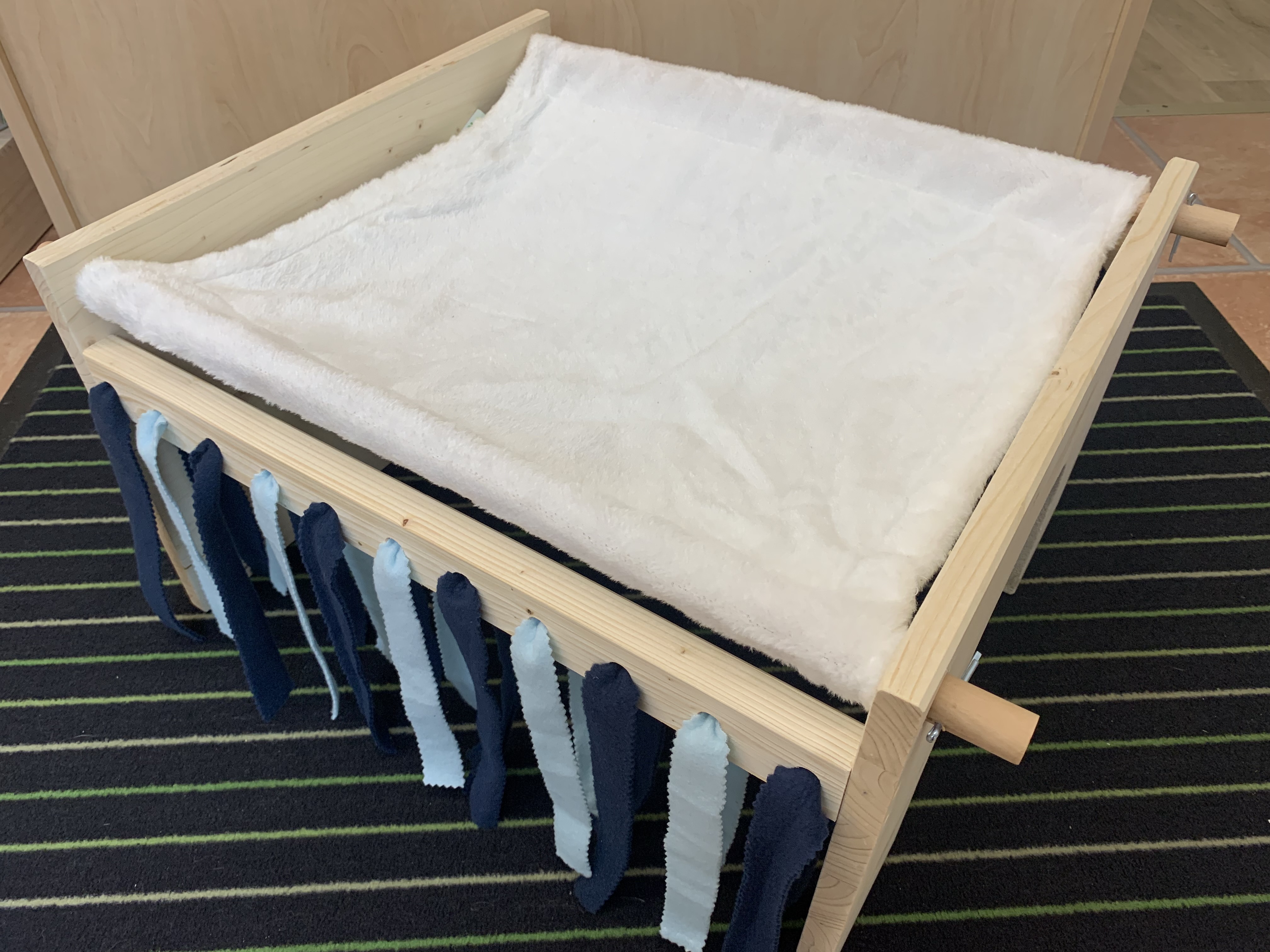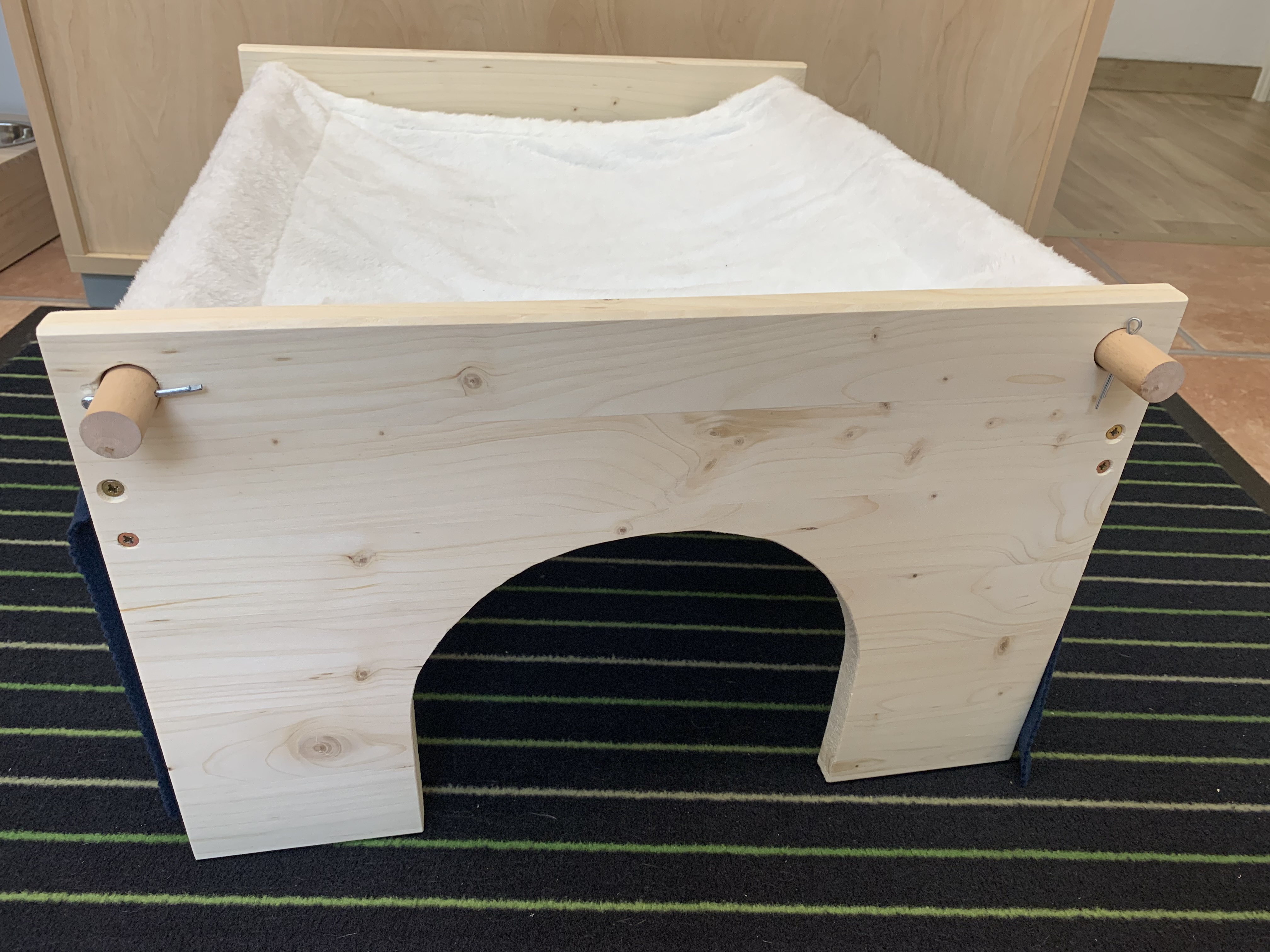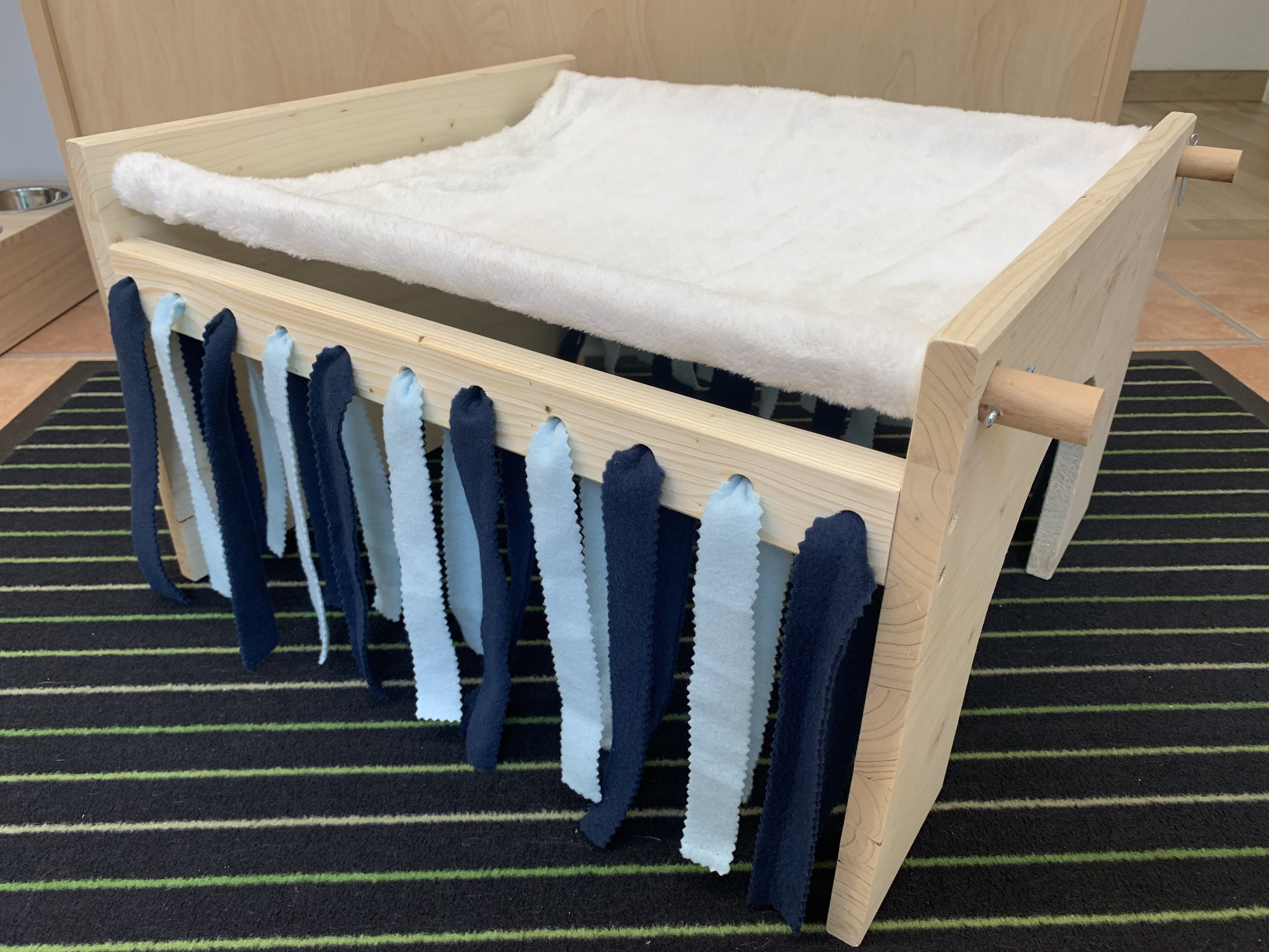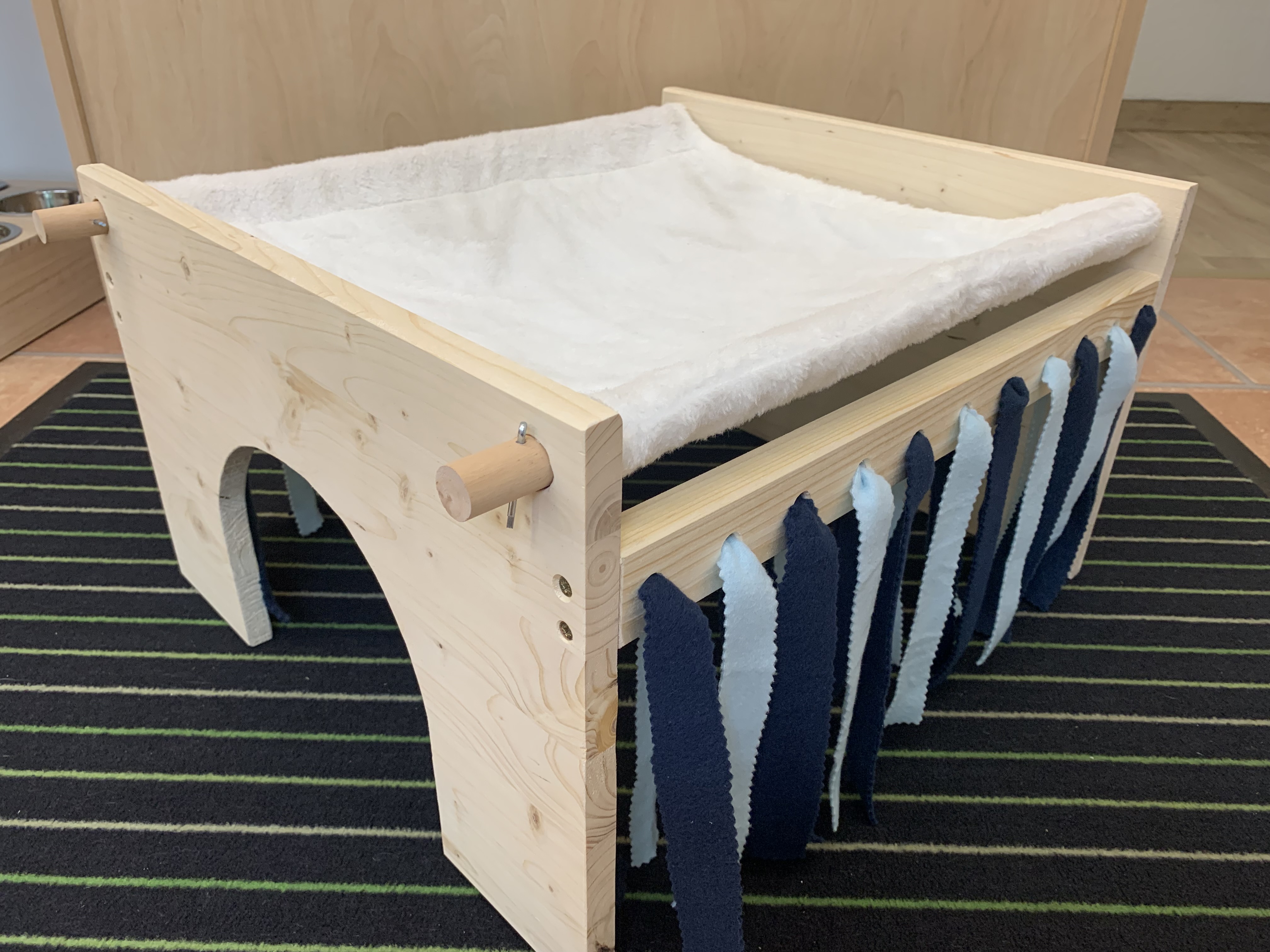 Unser Hängemattenhaus "Sweet dreams" kombiniert die beliebte Hängematte mit einem darunter liegenden Rückzugsort der teils aus einem Häuschen mit Holzwänden und teils aus Fransenvorhängen besteht. Die Hängematte kann zum Waschen einfach abgenommen werden, Stäbe raus, Matte ab, fertig. Es gibt natürlich auch Wechselhängematten und Ersatzfransenstreifen in verschiedenen Farben und Mustern, da ist bestimmt für jeden Geschmack etwas dabei. Das Häuschen hat nur auf der Frontseite einen Türausschnitt, gerne können wir Euch aber auf der gegenüberliegenden, geschlossenen Seite einen weiteren Ausgang sägen. Diesen findet Ihr in der Kreativecke.