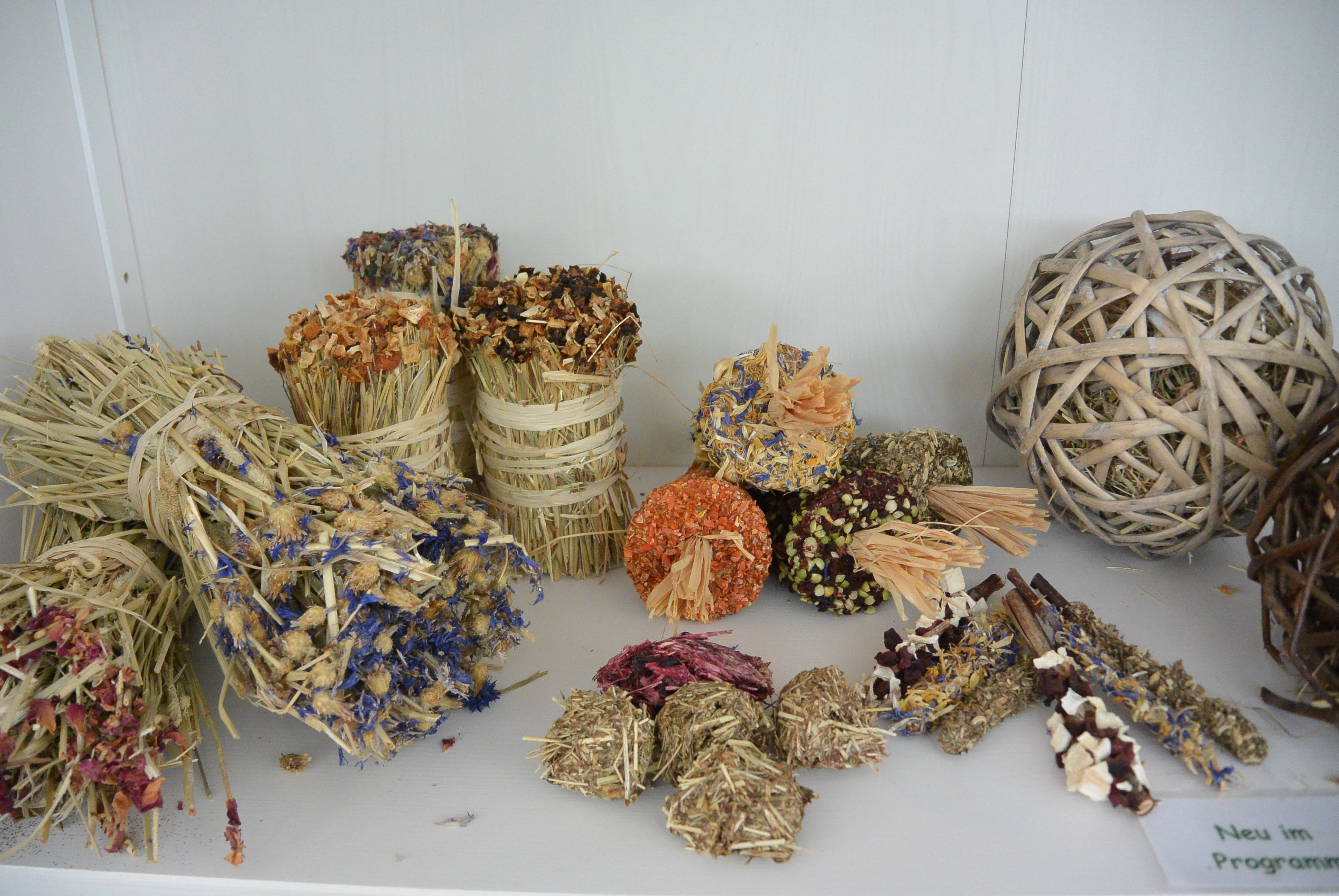 Gemüsewürfel, Blüten, Wurzeln, Leckerchen, Knabberäste usw.