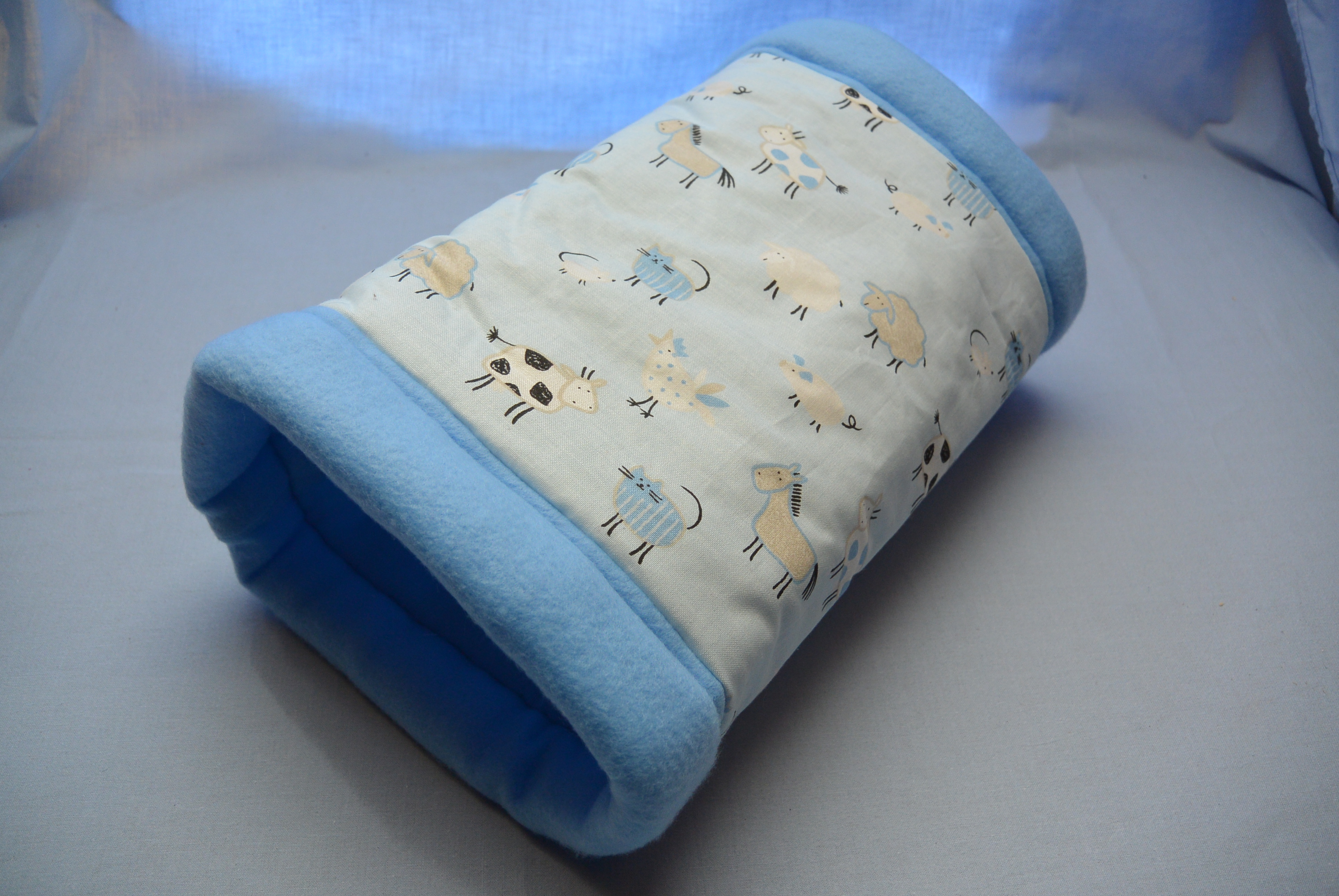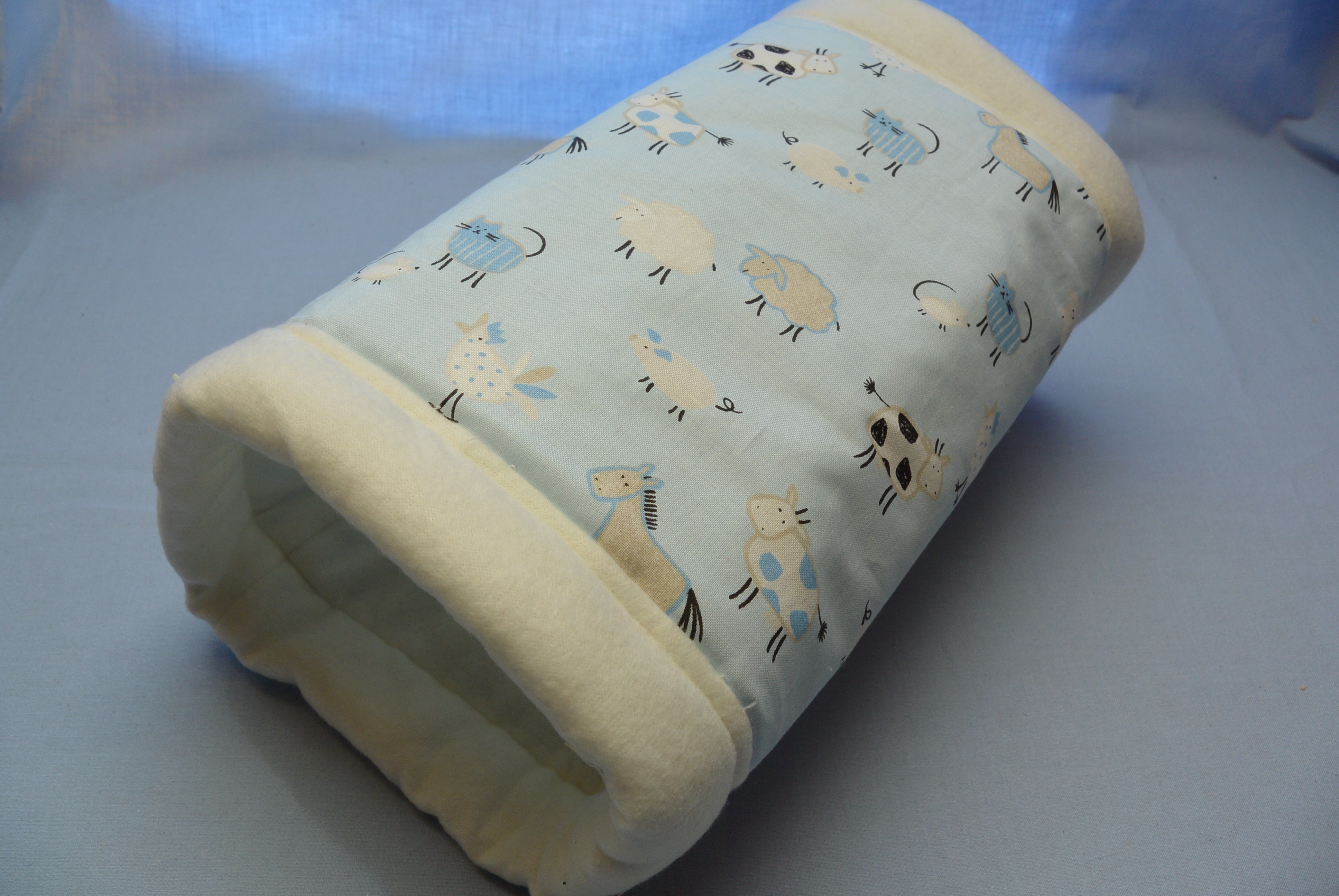 Maße: 30 cm / Ø 15 cm In verschiedenen Farben erhältlich: Außen: Baumwollstoff hellblau mit Tieren Innen: Fleecestoff hellblau od. altweiß Füllung: 20 mm Volumenvlies