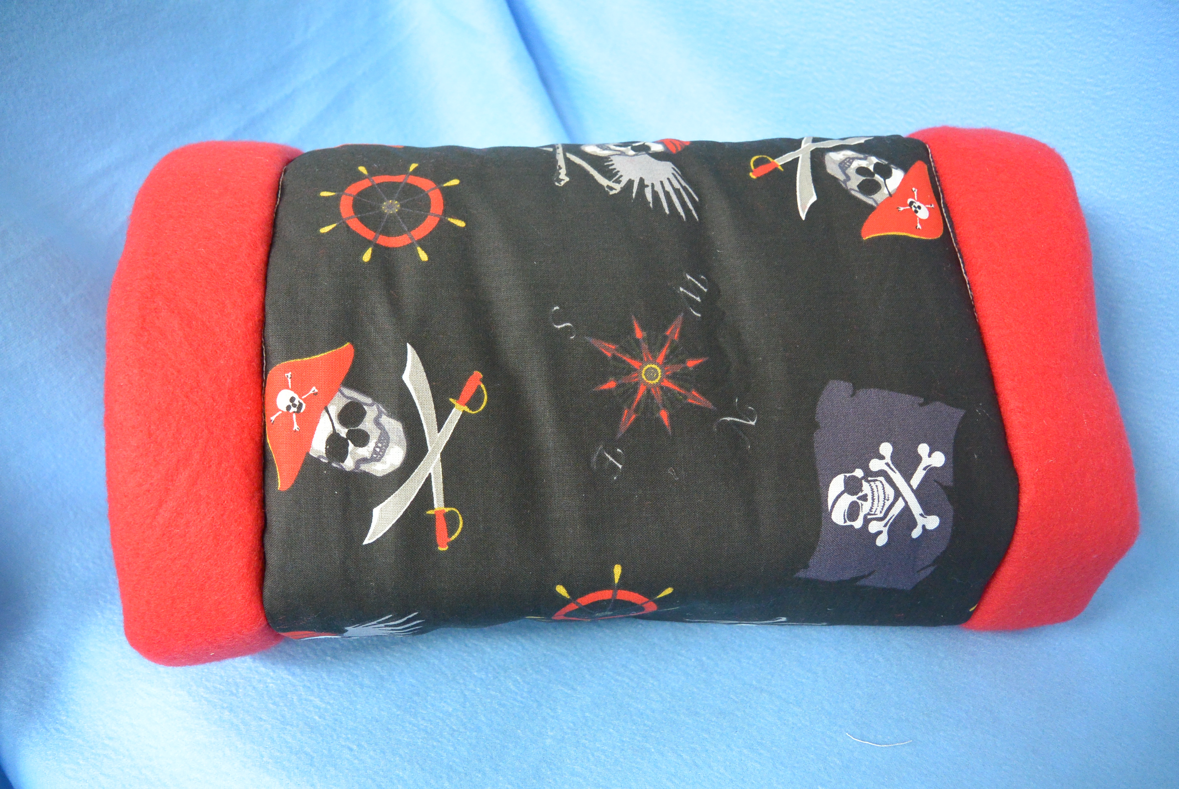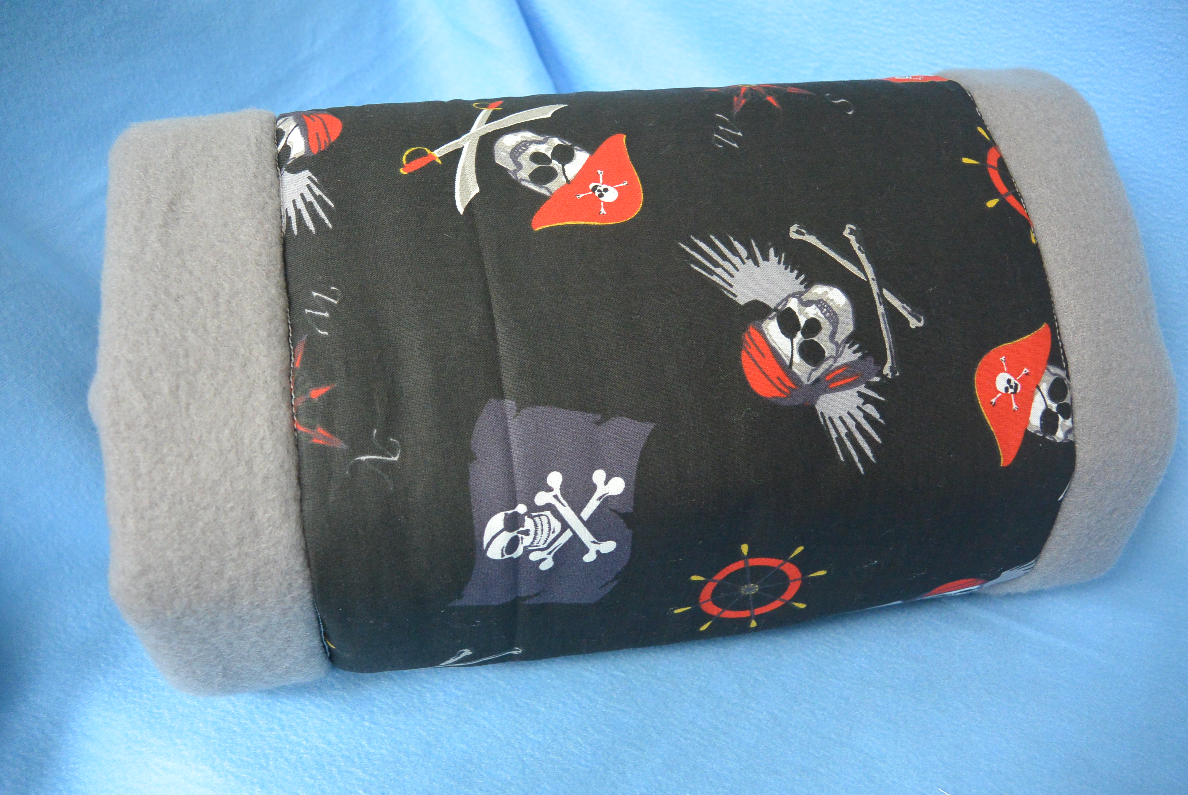 Maße: 30 cm lang / Ø 15 cm In verschiedenen Farben erhältlich: Außen: Baumwollstoff schwarz mit Piratenmotiv Innen: Fleecestoff rot oder grau Füllung: 20 mm Volumenvlies