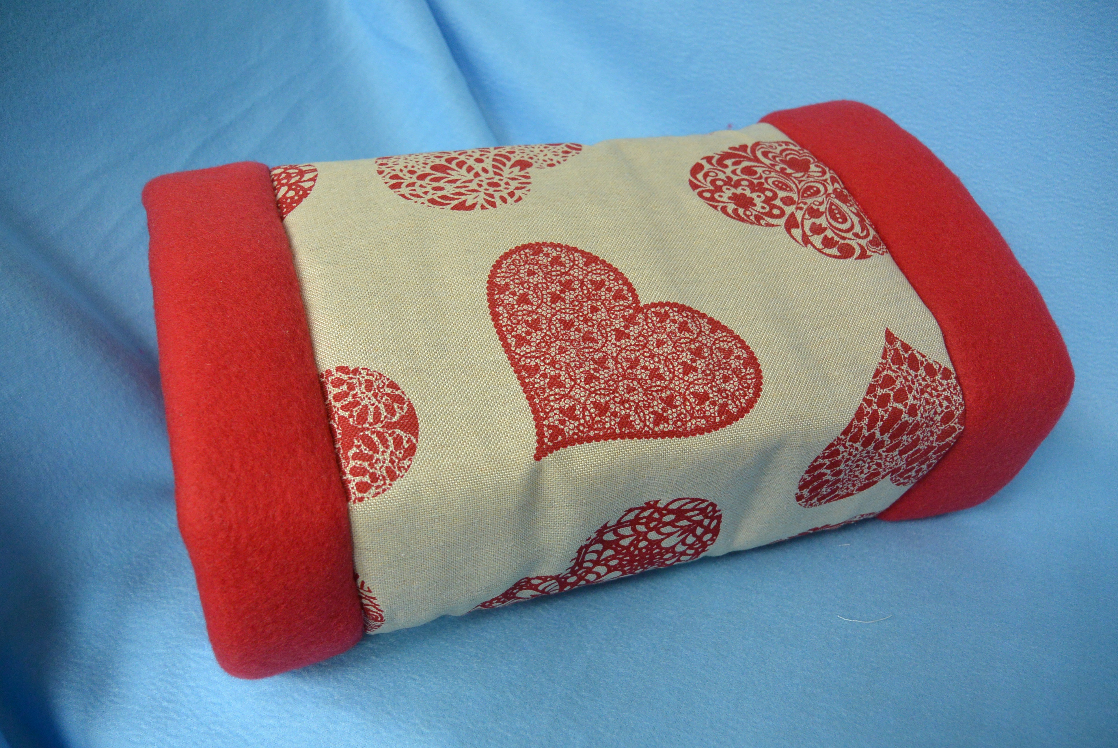 Maße: 30 cm lang / Ø 15 cm Material Außen: Baumwollstoff beige mit roten Herzen Innen: Fleecestoff rot Füllung: 15 mm Volumenvlies