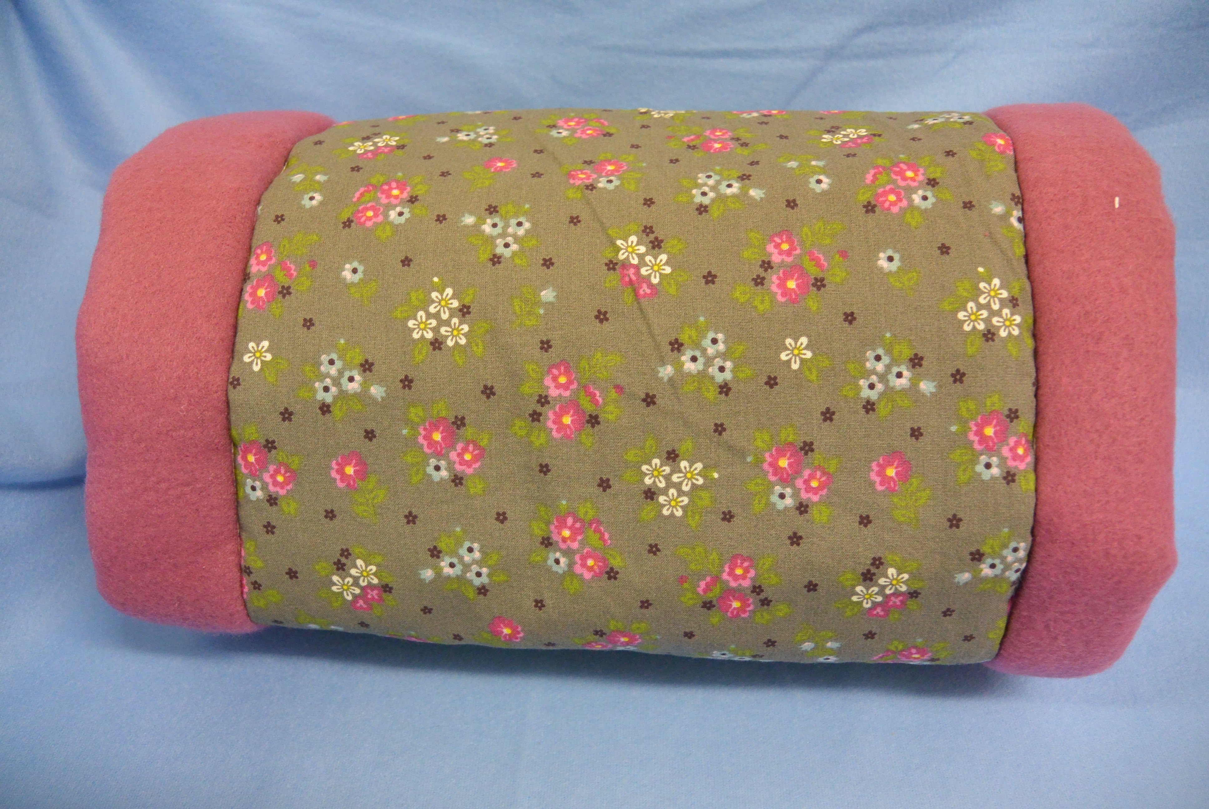 Maße: 30 cm lang / Ø 15 cm Material Außen: Baumwollstoff grau mit Blümchen Innen: Fleecestoff brombeere Füllung: 15 mm Volumenvlies