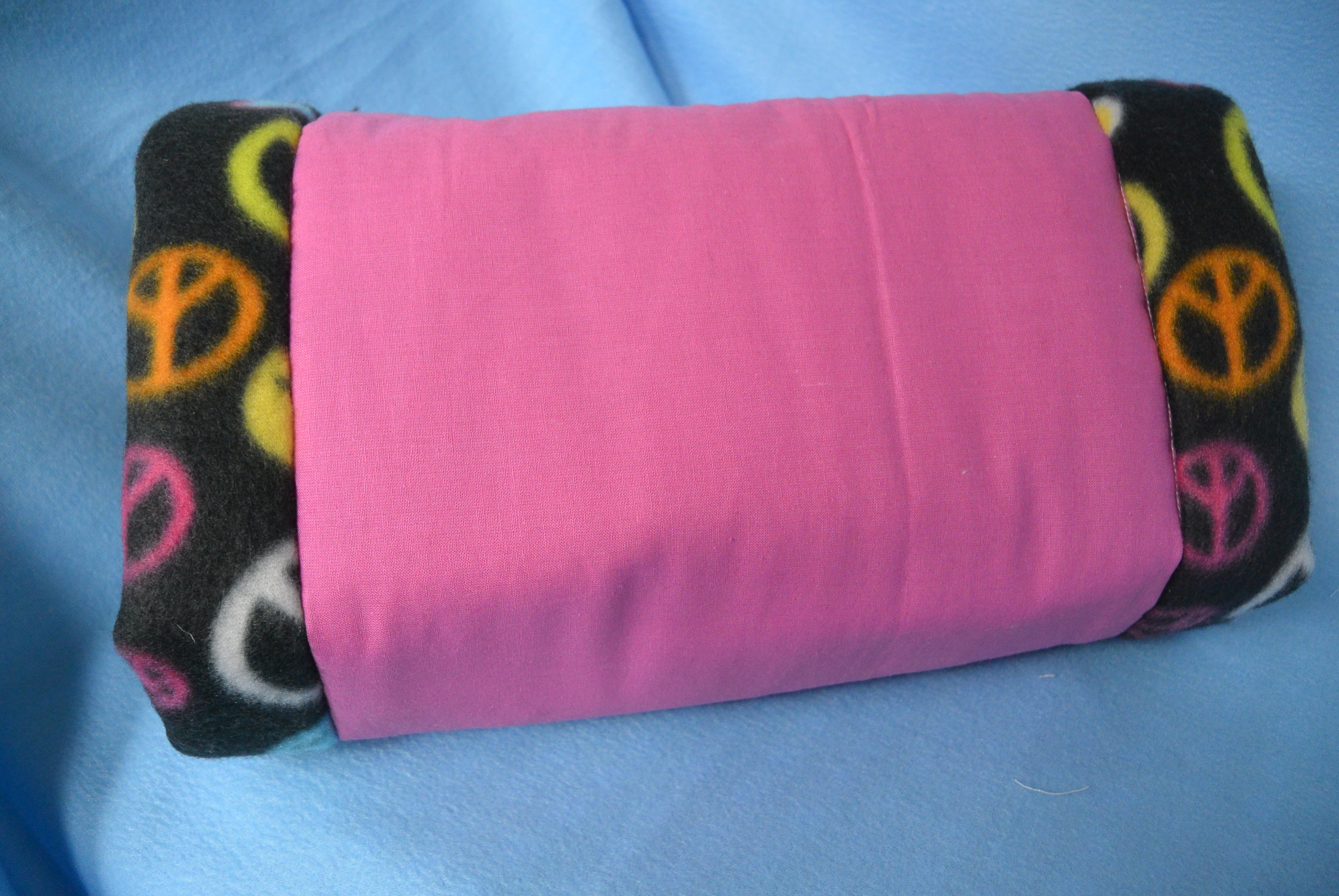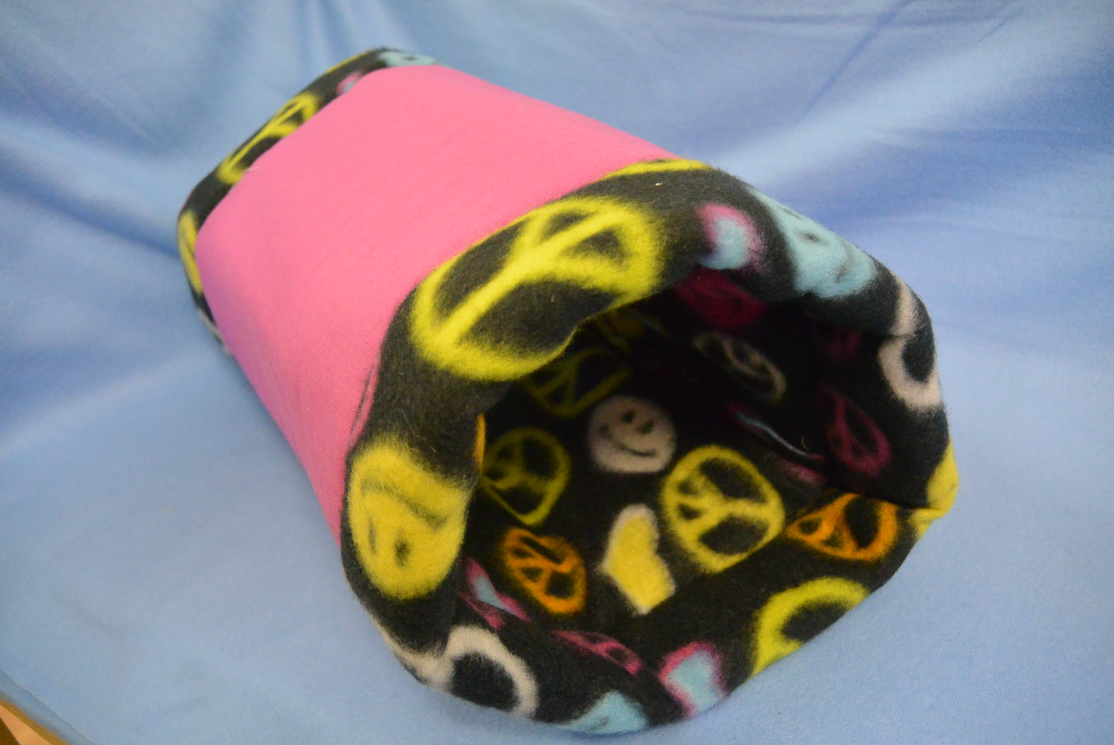 Maße: 30 cm lang / Ø 15 cm Material Außen: Baumwollstoff pink Innen: Fleecestoff schwarz / bunt Füllung: 15 mm Volumenvlies