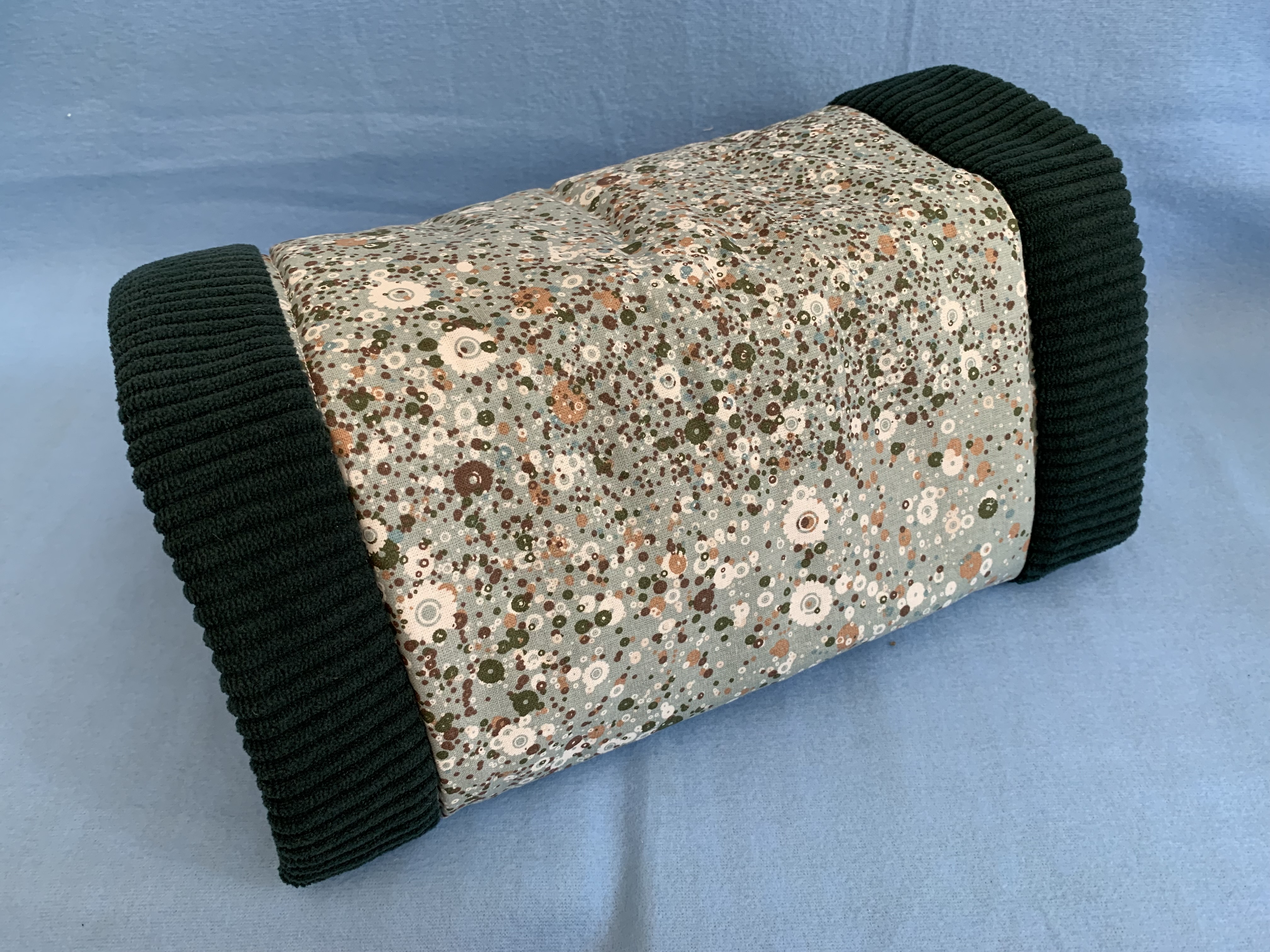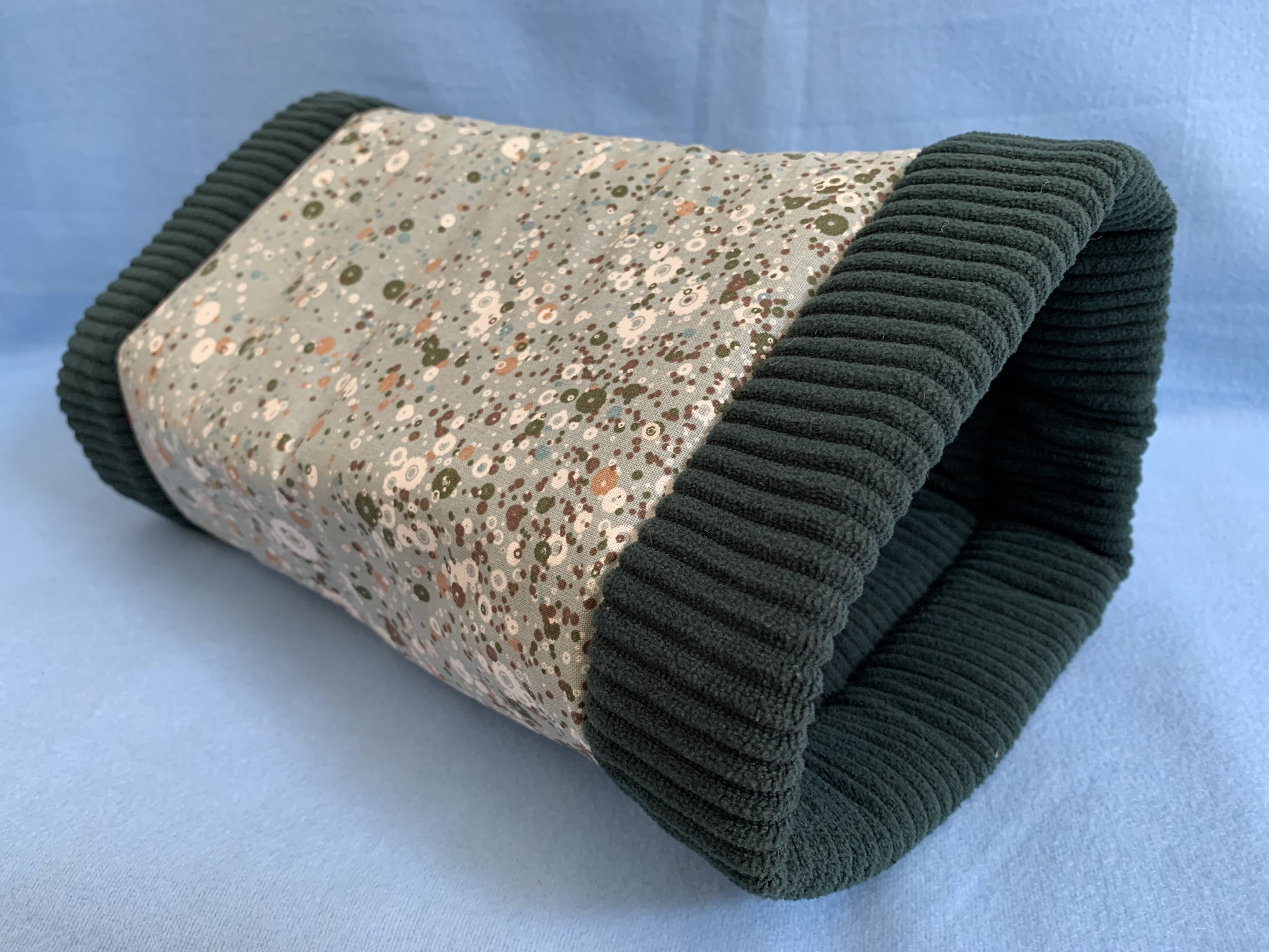 Die Kuschelrolle "Dandelion" besteht außen aus einem Baumwollstoff in Braun- und Grüntönen mit Blumenoptik. Innen ist sie mit einem gemütlichen Cordstoff in dunkelgrün ausgepolstert. Diese Kombination sieht besonders edel aus. Dazwischen ist eine dicke Lage Volumenfleece eingenäht, damit Schwein noch gemütlicher liegt. Durch den umgenähten Rand bleibt die Rolle gut offen (auch ohne Plastikschlauch drin). Alle Rollen können unbedenklich bei 30 Grad in die Waschmaschine aber bitte nicht in den Trockner.