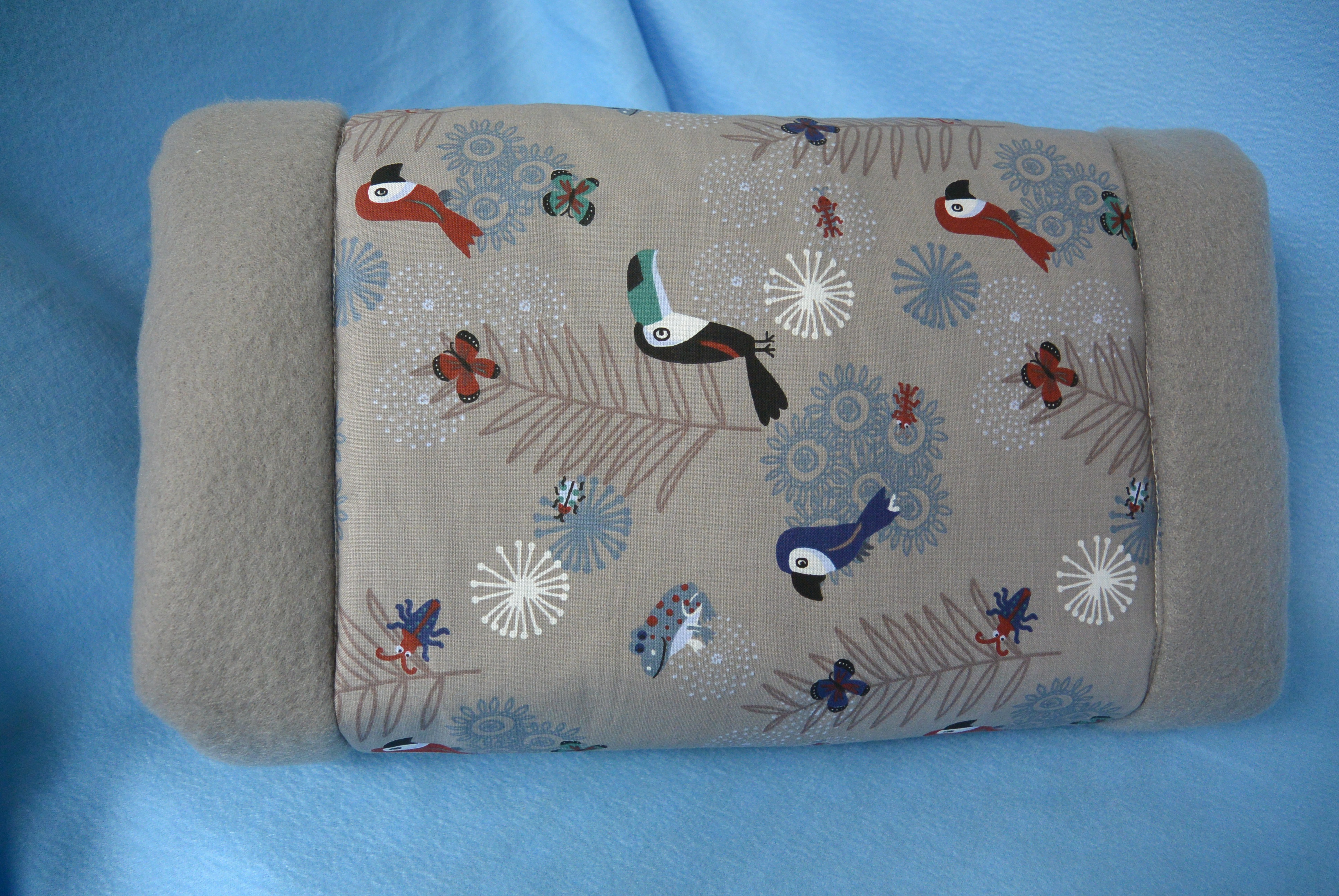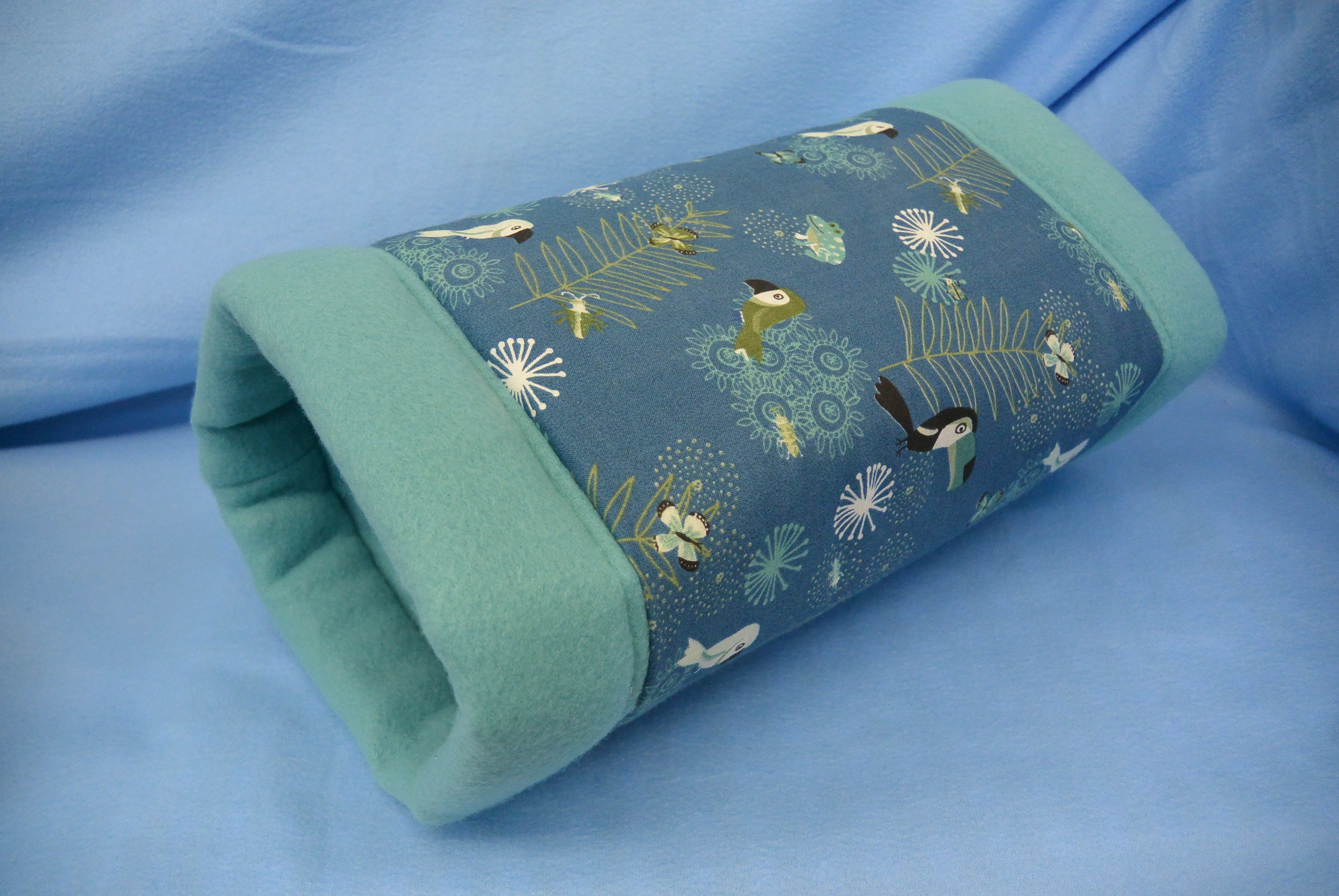 Maße: 30 cm lang / Ø 15 cm Material Außen: Baumwollstoff grau oder blau mit Vögeln Innen: Fleecestoff grau oder mint Füllung: 15 mm Volumenvlies