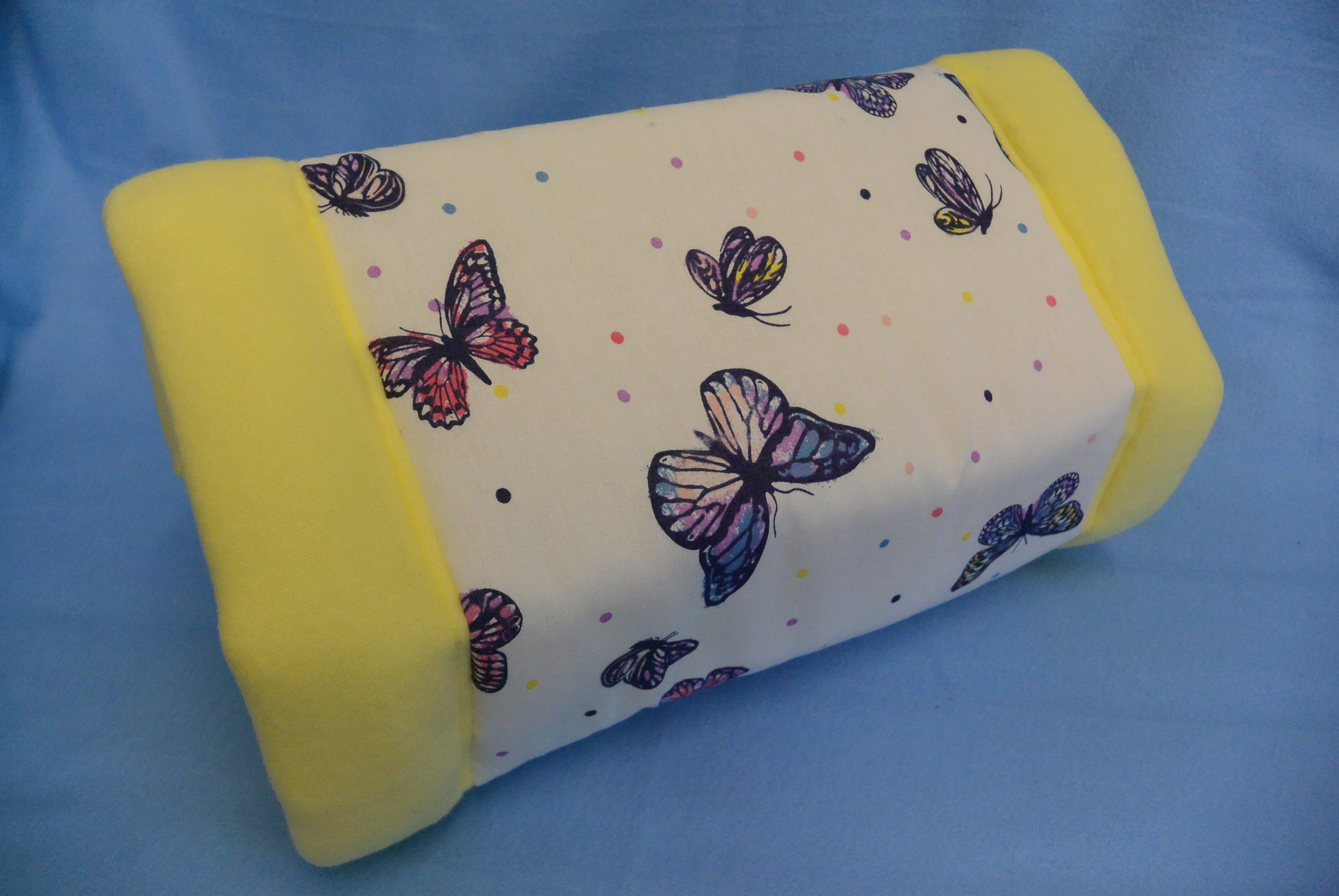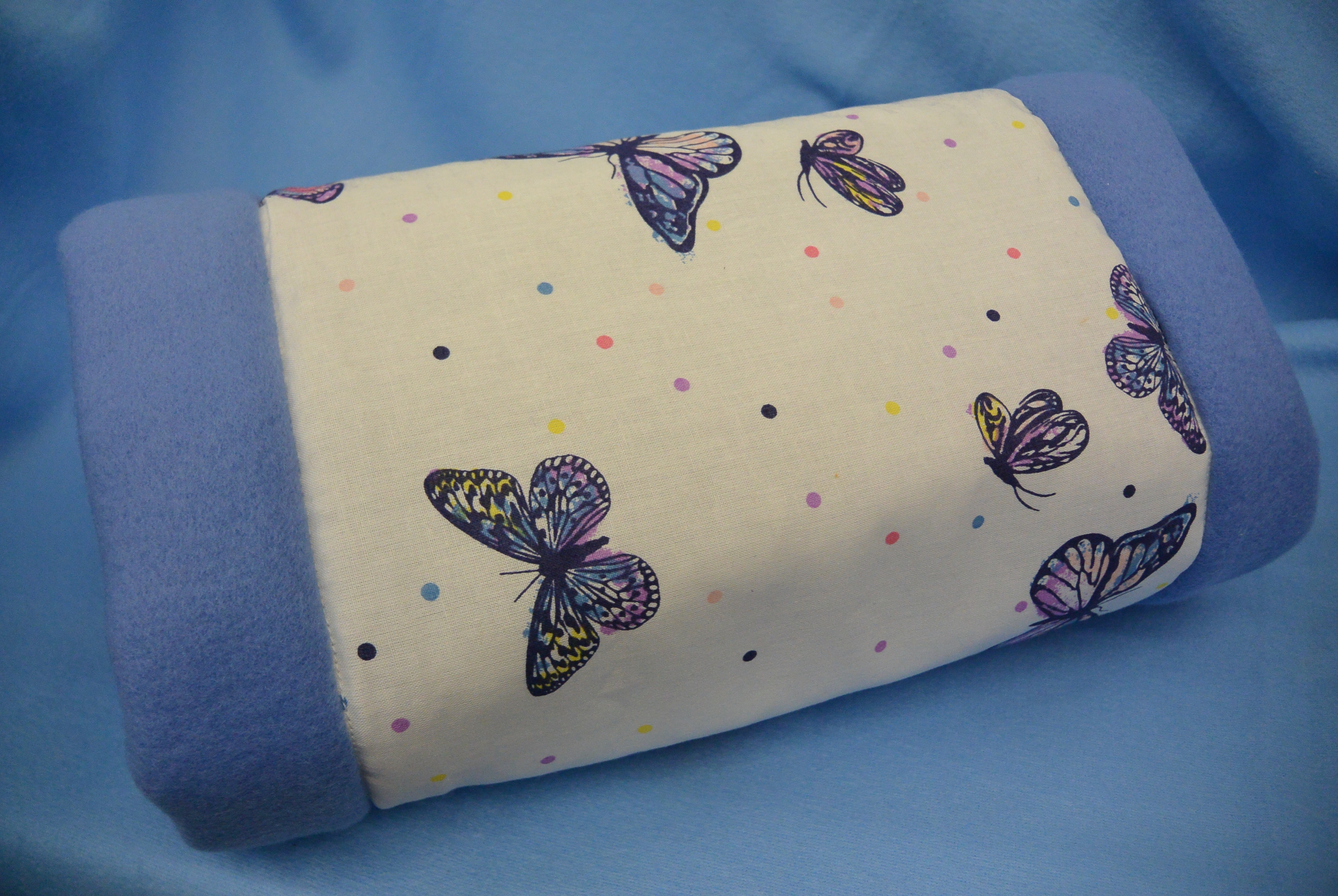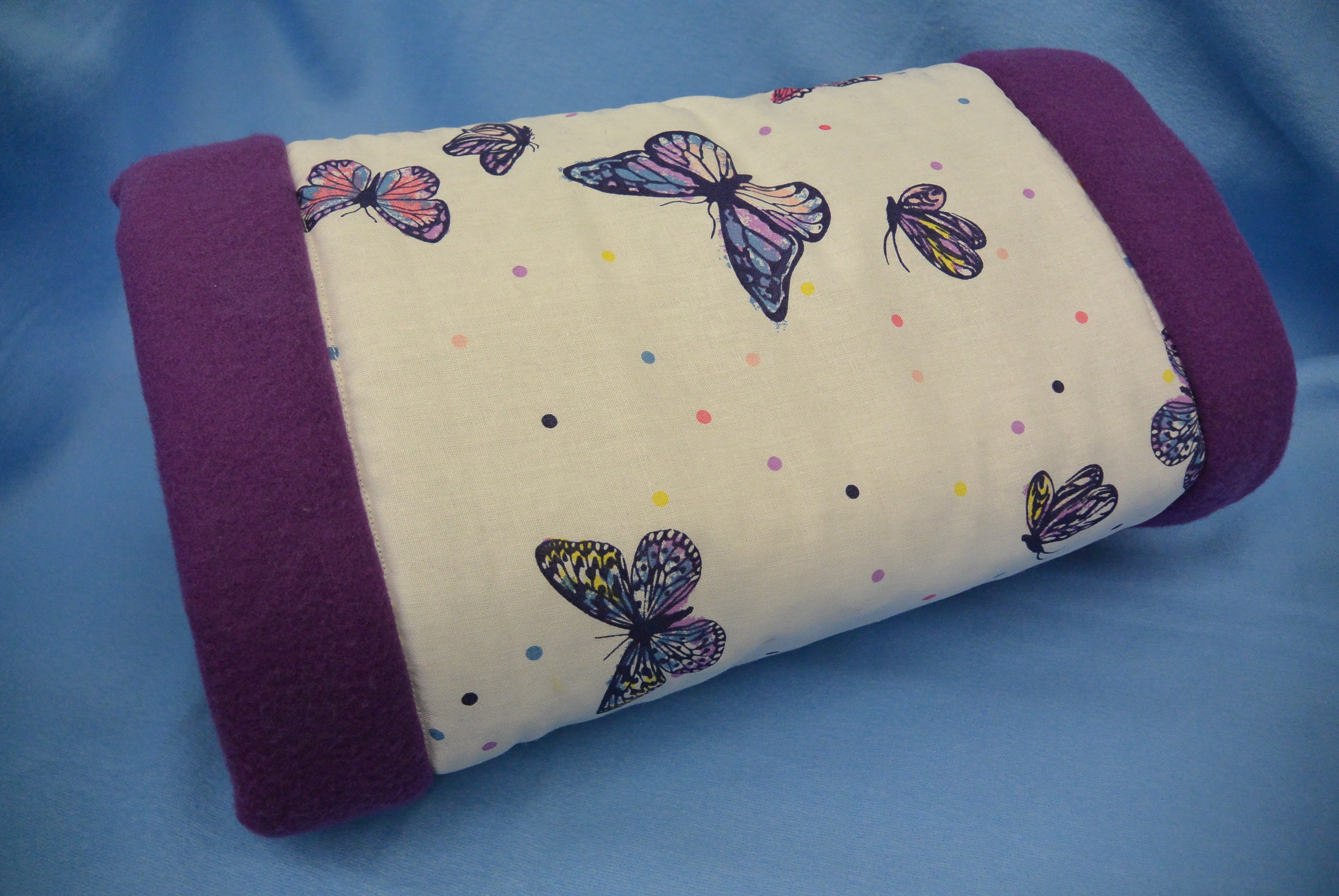 Maße: 30 cm / Ø 15 cm In verschiedenen Farben erhältlich: Außen: Baumwollstoff lila Schmetterlinge Innen: Fleecestoff lila, hellblau, hellgelb Füllung: 20 mm Volumenvlies