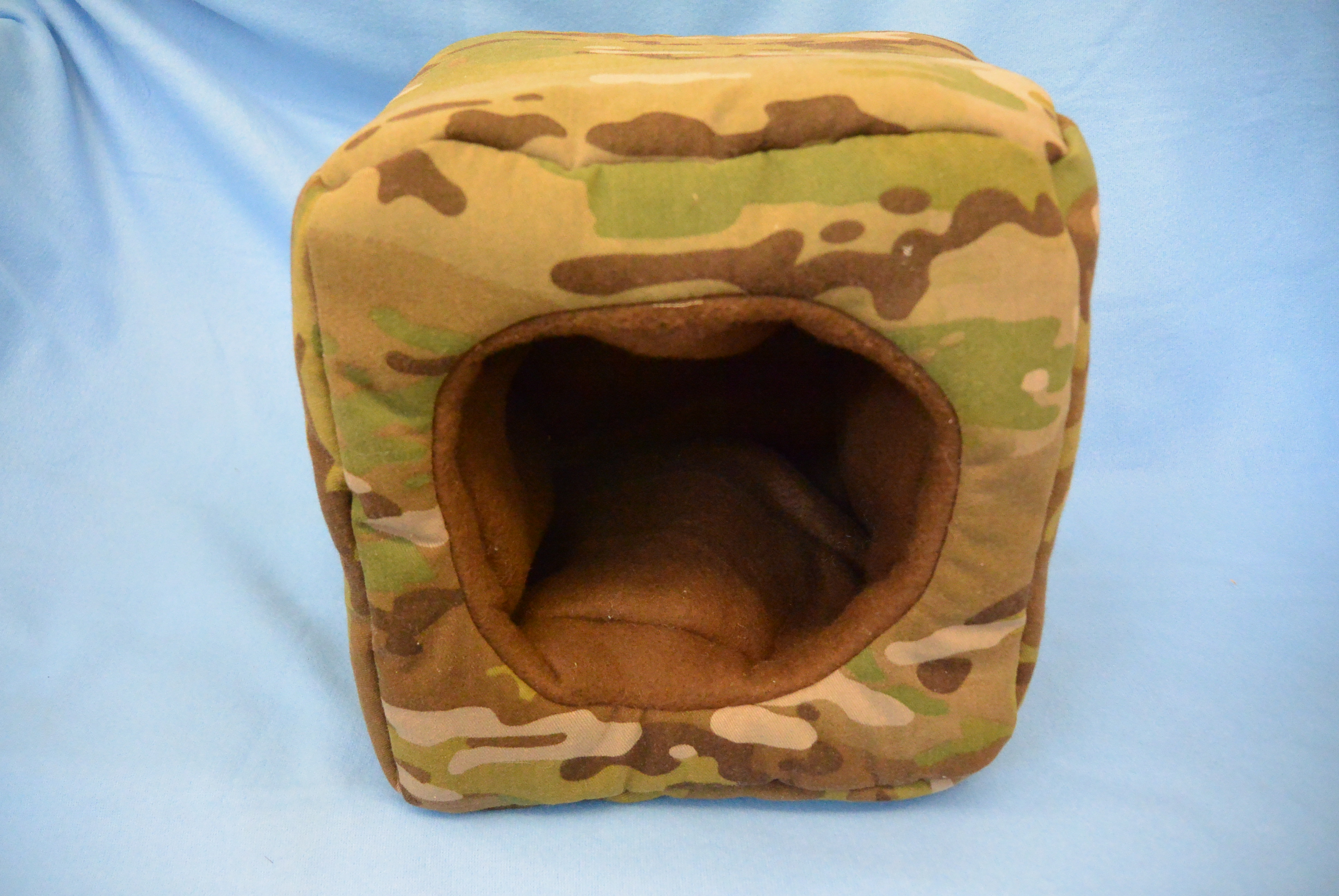 Maße: 22 x 22 x 22 cm Material Außenseite: Baumwollstoff Camouflage Innenseite: Fleecestoff braun Füllung: 20 mm Volumenvlies Waschbar bei 30 Grad Musterverlauf kann abweichen