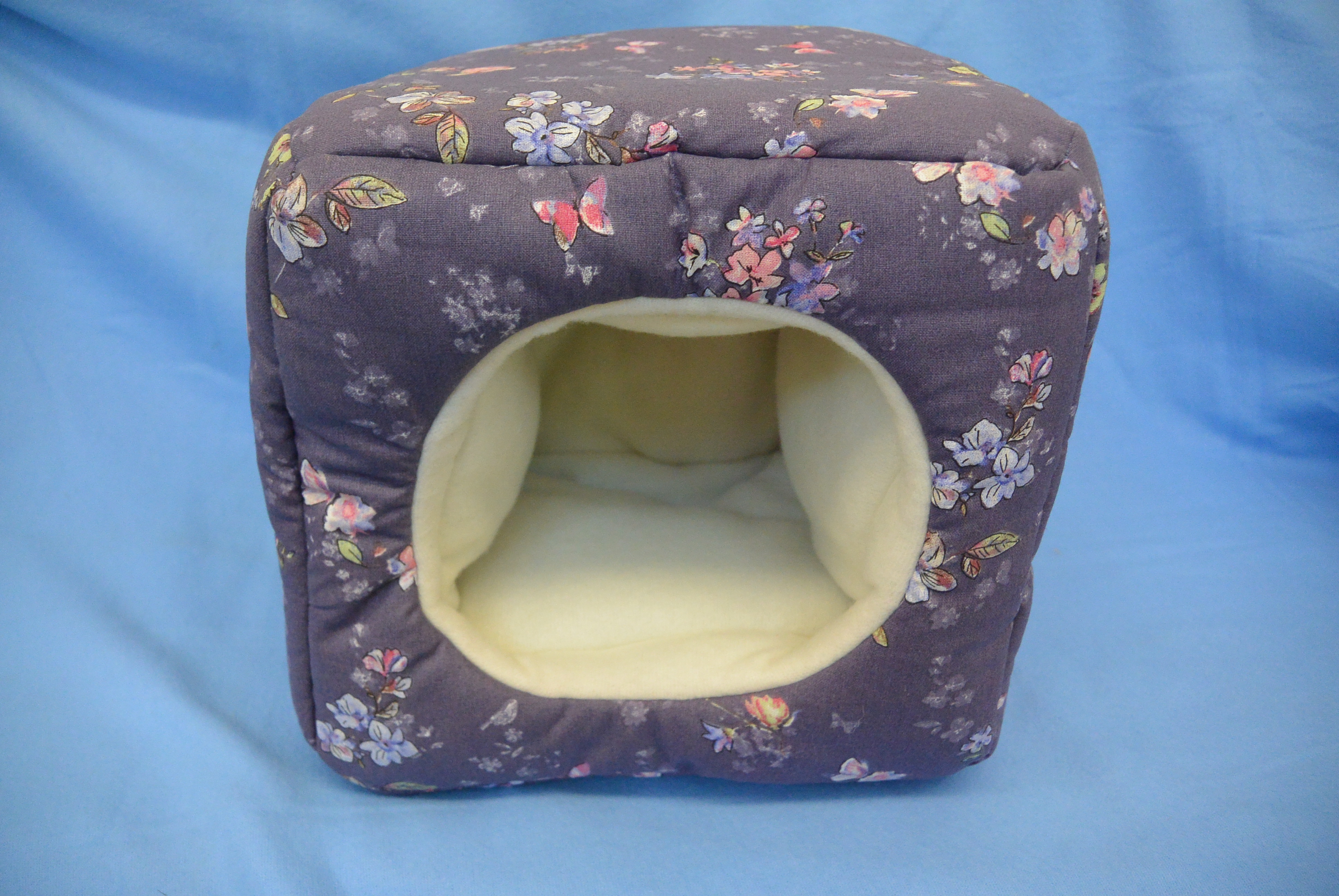 Maße: 22 x 22 x 22 cm Material Außen: Baumwollstoff lila mit Blumenmuster Innen: Fleecestoff altweiß Füllung: 20 mm Volumenvlies Waschbar bei 30 Grad Musterverlauf kann abweichen