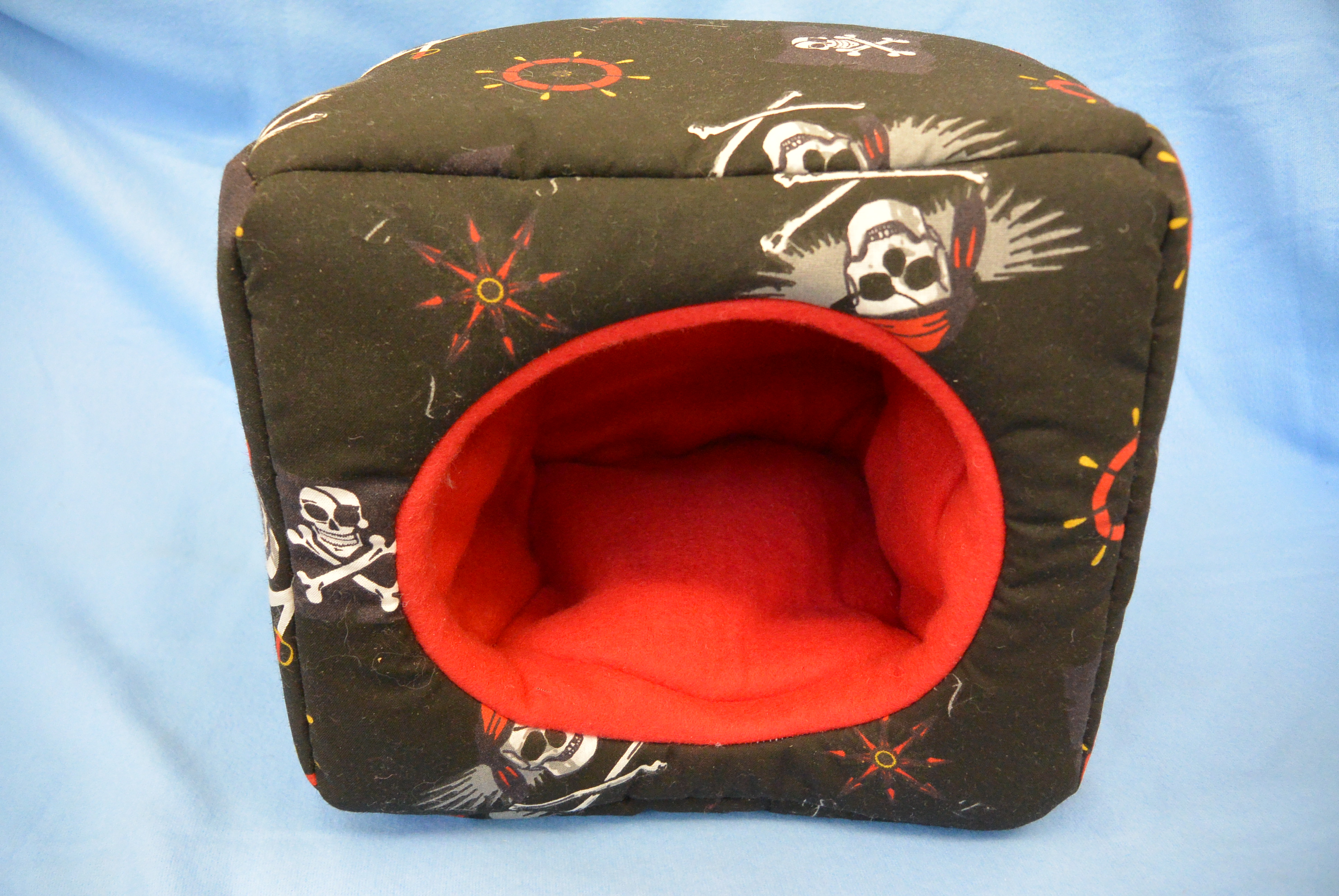 Maße: 22 x 22 x 22 cm Material Außen: Baumwollstoff schwarz mit Piratenmotiv Innen: Fleecestoff rot Füllung: 20 mm Volumenvlies Waschbar bei 30 Grad Musterverlauf kann abweichen