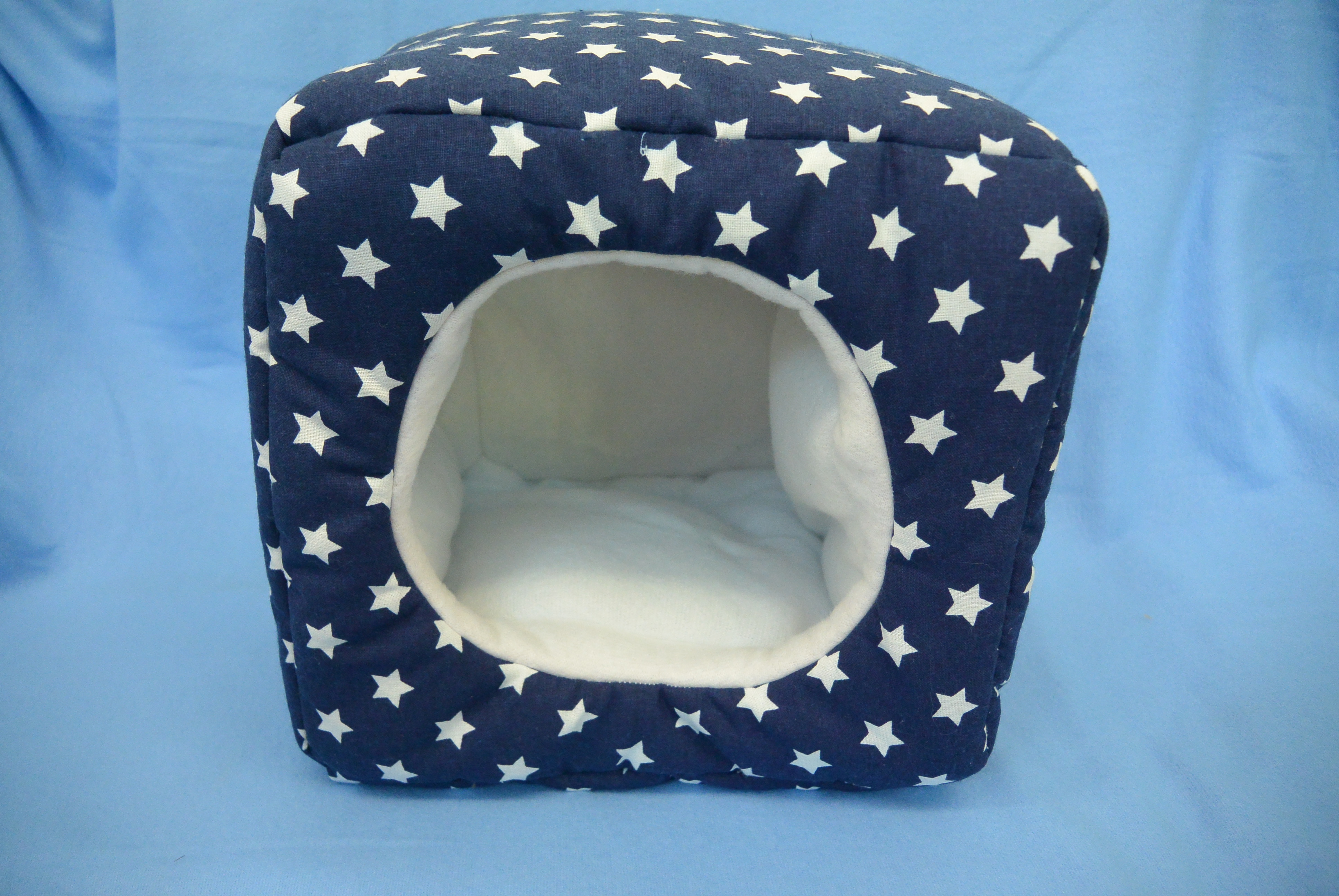 Maße: 22 x 22 x 22 cm Material Außen: Baumwollstoff dunkelblau mit weißen Sternen Innen: Fleecestoff weiß Füllung: 20 mm Volumenvlies Waschbar bei 30 Grad Musterverlauf kann abweichen