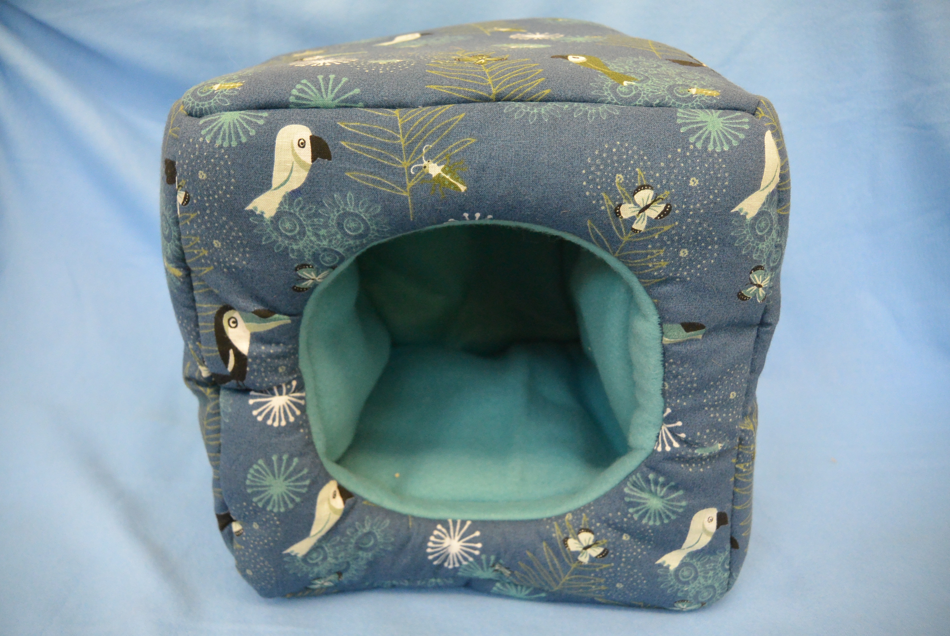 Maße: 22 x 22 x 22 cm Material Außen: Baumwollstoff blaumint mit Vögeln Innen: Fleecestoff min Füllung: 20 mm Volumenvlies Waschbar bei 30 Grad Musterverlauf kann abweichen