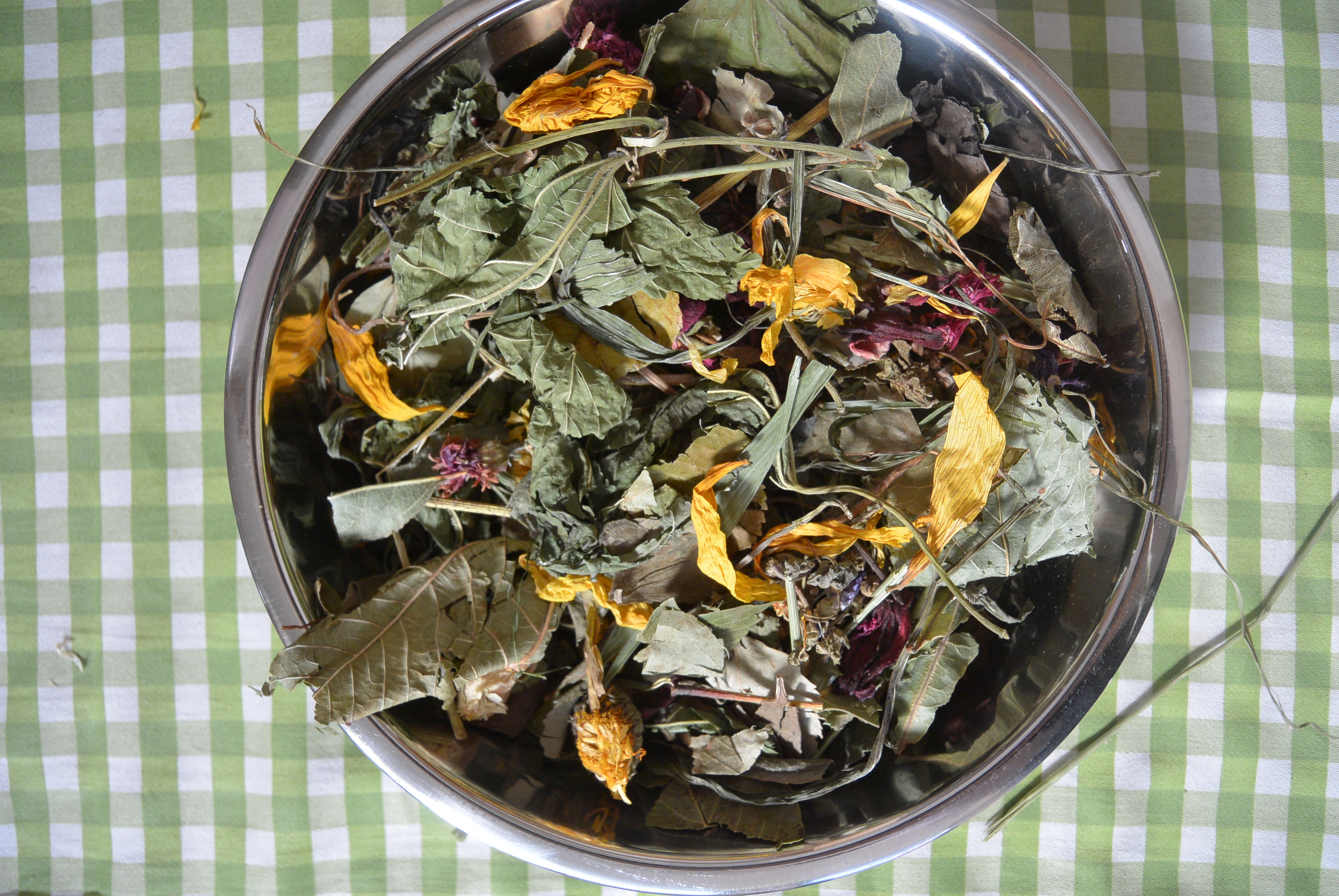 Löwenzahn, Apfelblätter, Ginkgoblätter, Malvenblätter, Maulbeerbaumblätter, Topinamburkraut, Hibiskusblüten, Kirschblätter, Spitzwegerich, Echinacea, grüner Dinkel, grüner Hafer, Kaktusblüten, Ringelblumenblüten, Tagetesblüten, Weidenblätter, Birkenblätter, Birnenblätter, Brunnenkressekraut, Kornblumenblüten, Sonnenblumenblütenblätter, Lindenblütenblätter, Rosenblütenblätter